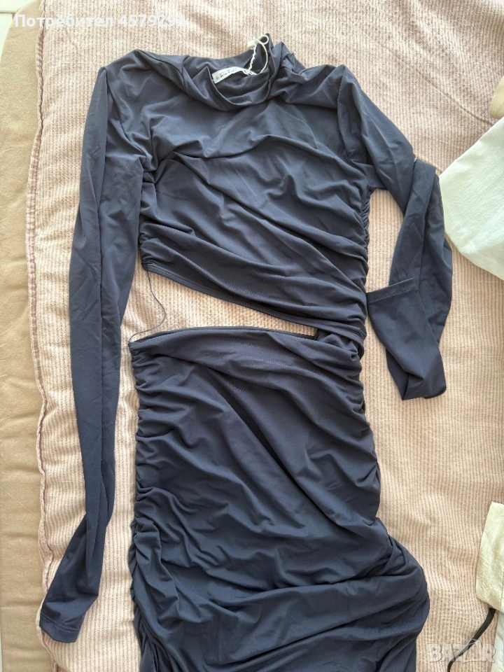 Тъмно синя рокля по тялото. Не е обличана, размер Xs, от мека разтеглива материя.