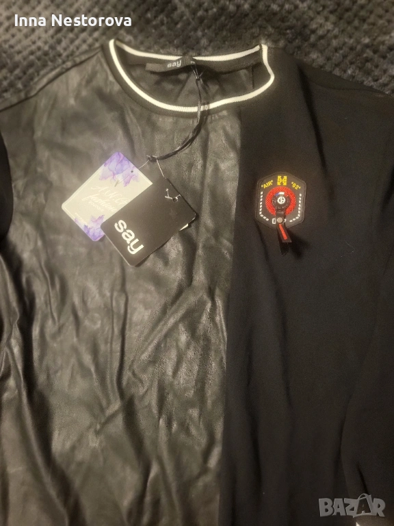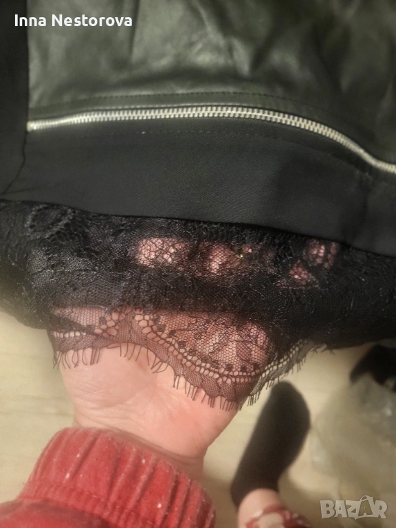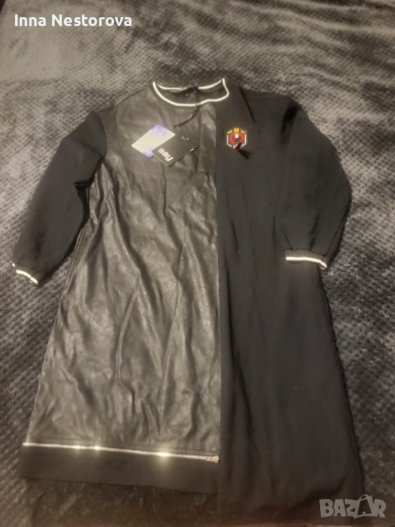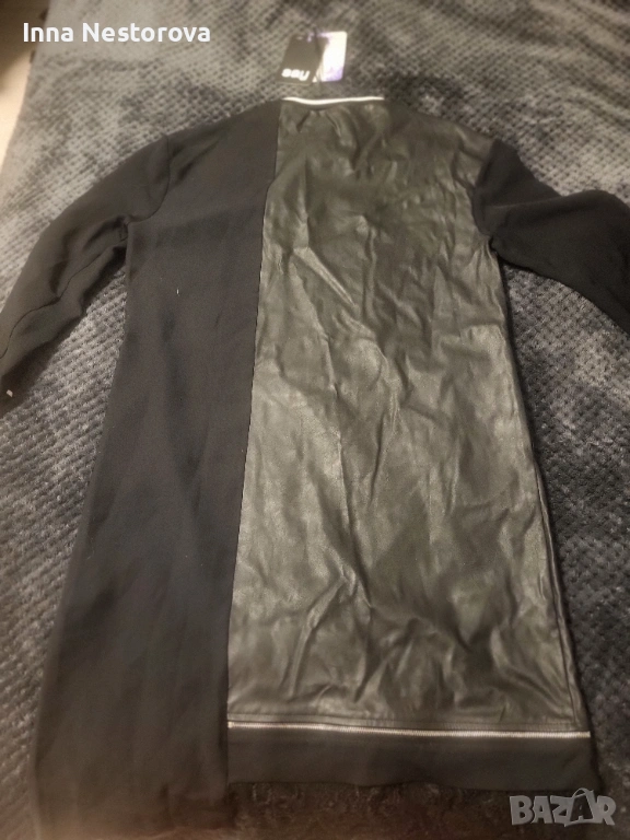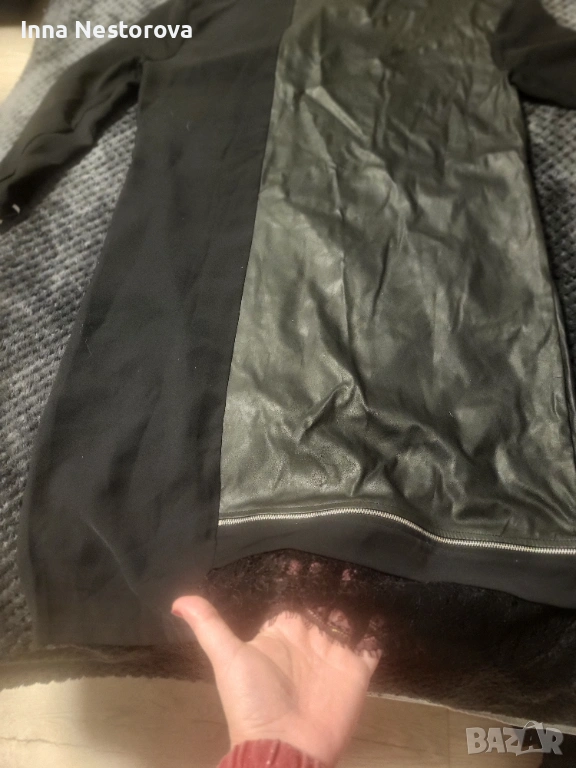 Много красива и стилна рокля. Половината е с материя като кожа, а другата половина е от плат. Долу има дантела.