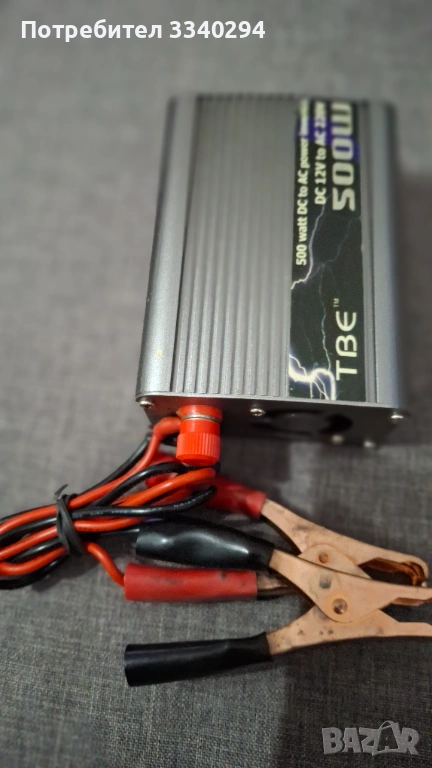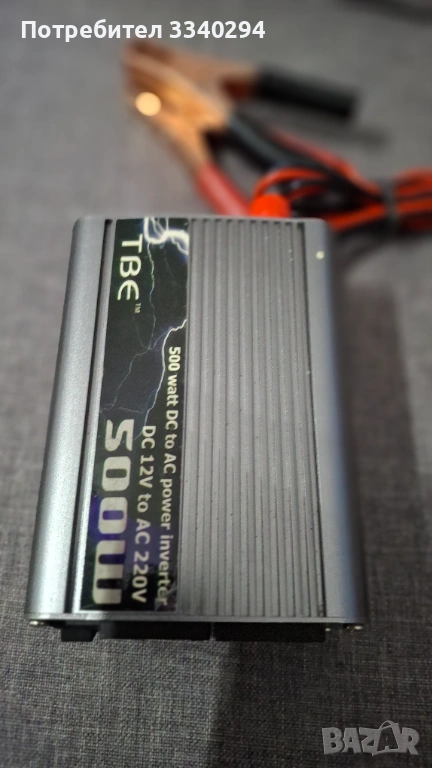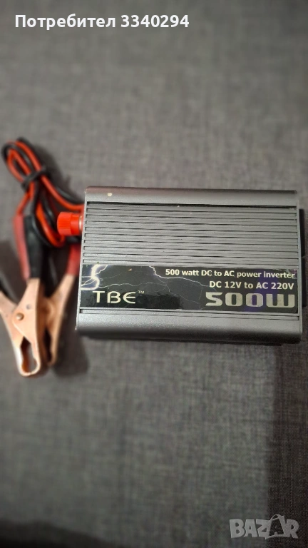 Продавам инвертор TBE 500 W, преобразува 12 V от акумулатор в 220 V. Подходящи за лаптопи, зарядни, малки уреди, къмпинг. Включва кабели с щипки за директно свързване към акумулатор. Работи без проблеми.