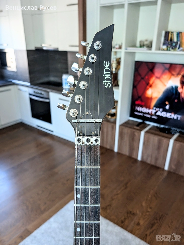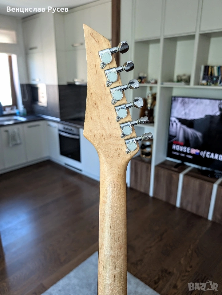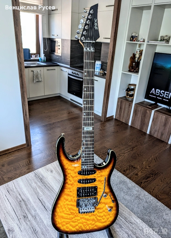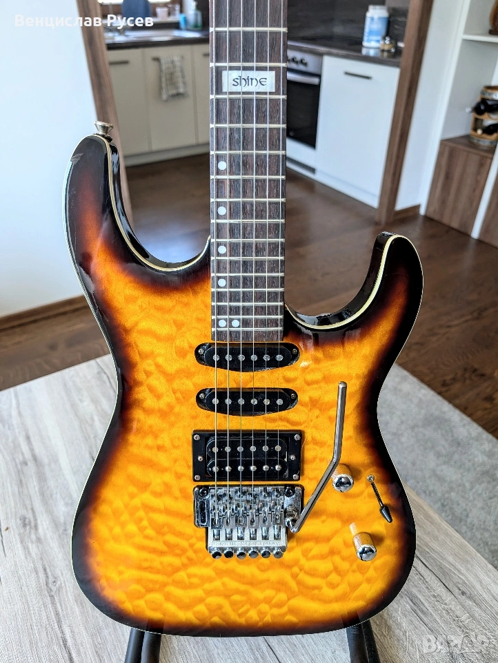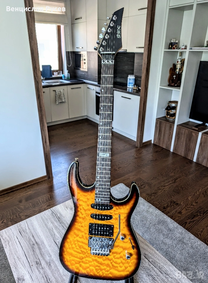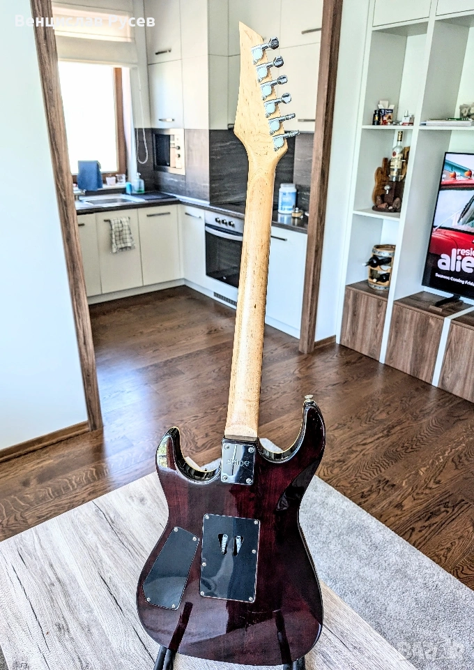 Китарата е произведена 2006 г. в Корея. Bolt-On конструкция, Basswood тяло с Flamed Maple top, 1 piece Maple гриф с Rosewood фингърборд, 24 Jumbo прагчета, 25.5" мензура, супер стабилно Floyd Rose тремоло, 5 way switch, 1 volume, 1 tone. Адаптерите са в конфигурация H/S/S. Инструментът е в отлично състояние, с нови струни 9-42 и професионален сетъп с нисък екшън. Предпочитам преглед и тест, но мога да я изпратя и с Еконт, добре опакована.