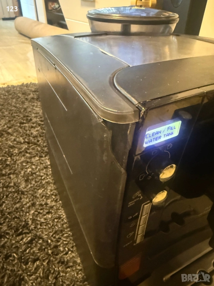 Машината работи, но не отчита контейнера за вода. Продавам я цяла за части или ремонт. Контейнера за водата му е счупена едната дръжка, липсва и малко парче от едната страна.