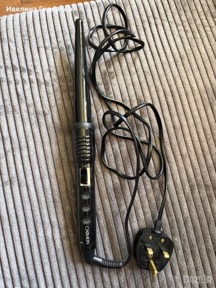 Продавам конусовидна маша за къдрене Carmen, модел C81039. Уредът е в много добро състояние и работи без проблем. Подходяща е за оформяне на естествени къдрици и вълни.