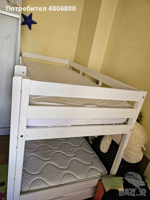 Ползвани са в детска стая. Полезното в случая е, че леглата може да се ползват и напълно самостоятелно като две напълно отделни в зависимост от подредбата във вашето жилище. Дървени е конструкцията, здрава и същевременно много добре запазена (няма нищо счупено или повредено). Височината на двете легла като двуетажно е 140 см, когато са по отделно е 70 см и самите легла си стават и за възрастни (90х200 см).