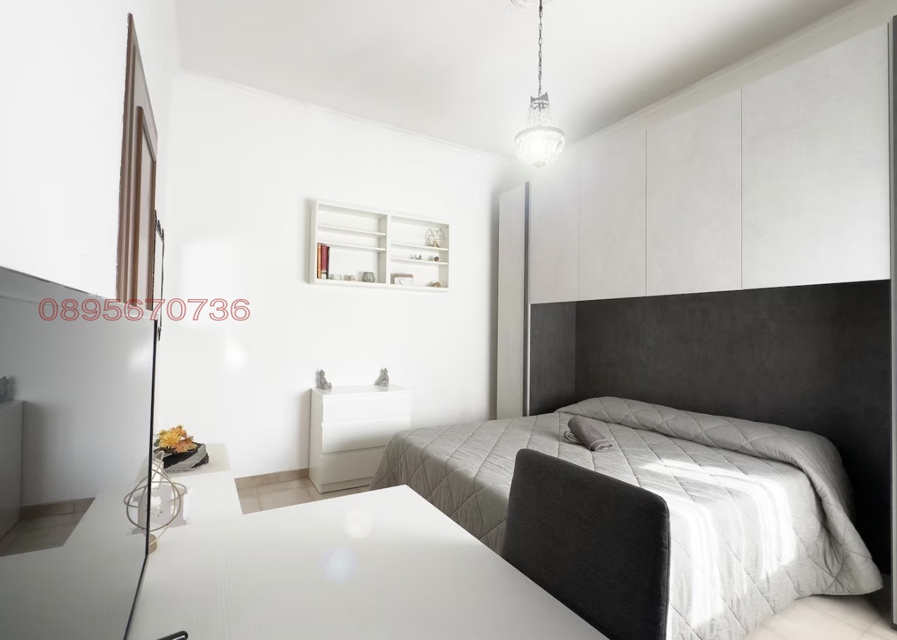 Спалнята е организирана практично, с удобно легло и вградени гардероби, които осигуряват достатъчно място за съхранение, без да натоварват интериора. Големите прозорци с ефирни пердета допринасят за светлата и приветлива атмосфера през целия ден.