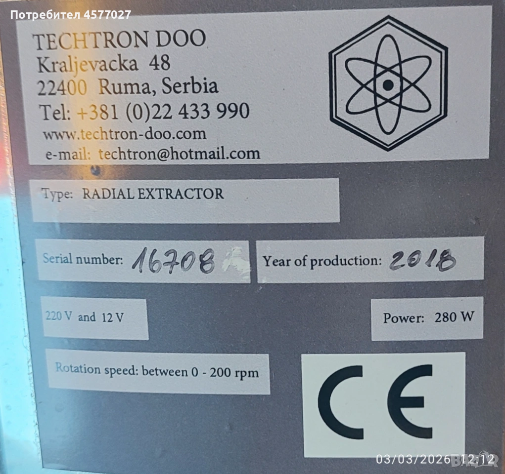 Центрофугата е сръбска, радиална, автоматична и ръчна, 4/20 рамки на фирмата TECHTRON.