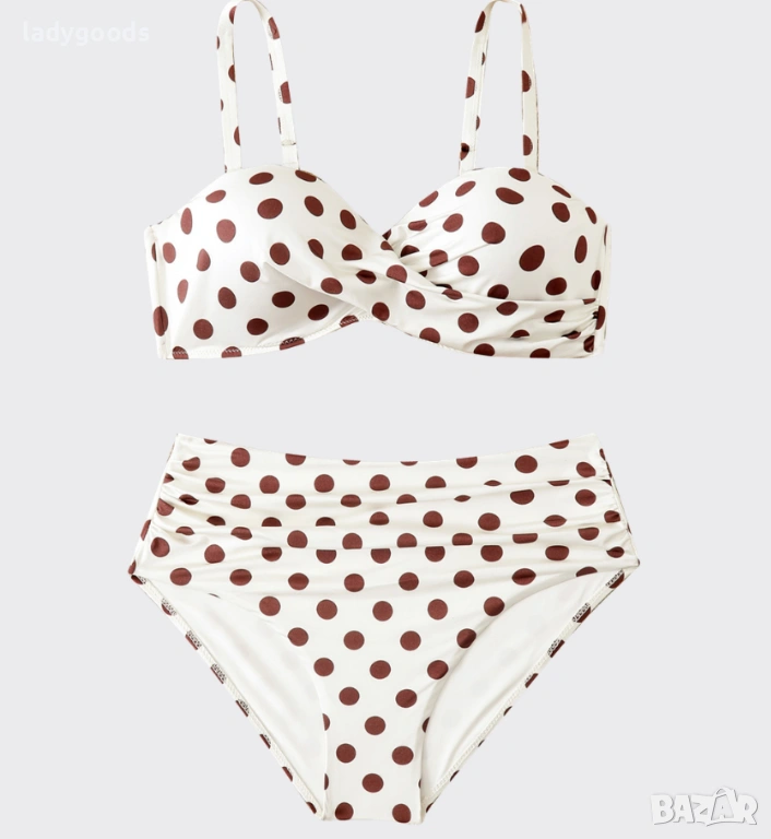 Този модел бански костюм от две части,реплика на марката - Ysabel Mora,съчетава ретро естетика,с модерен комфорт. Отличава се със следните детайли:
