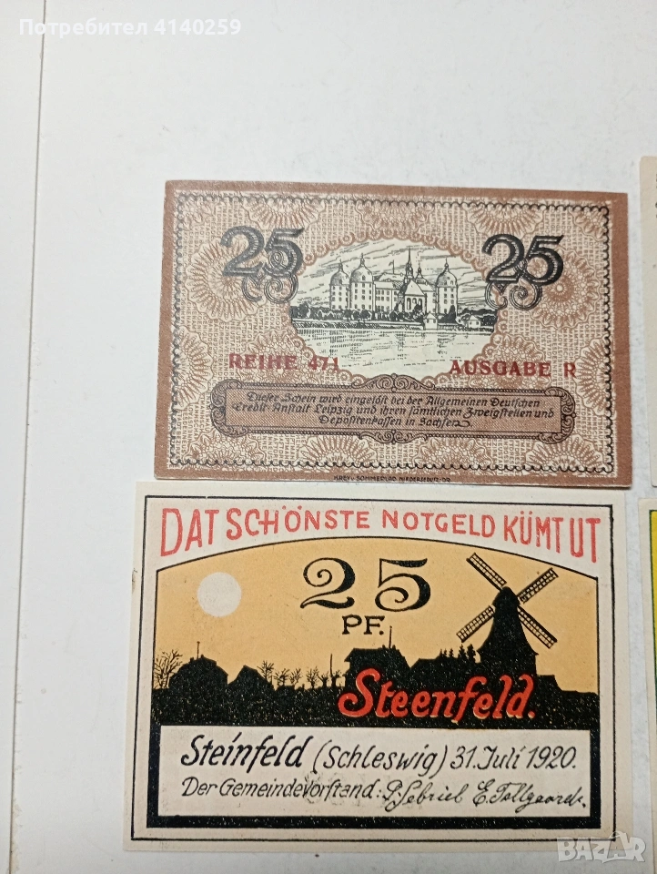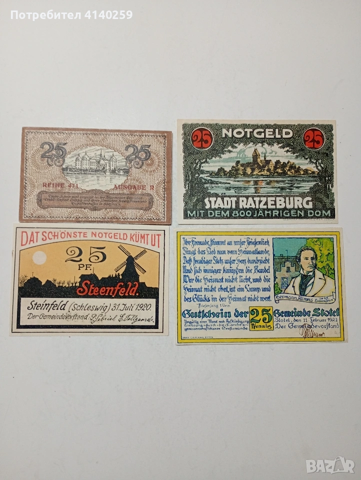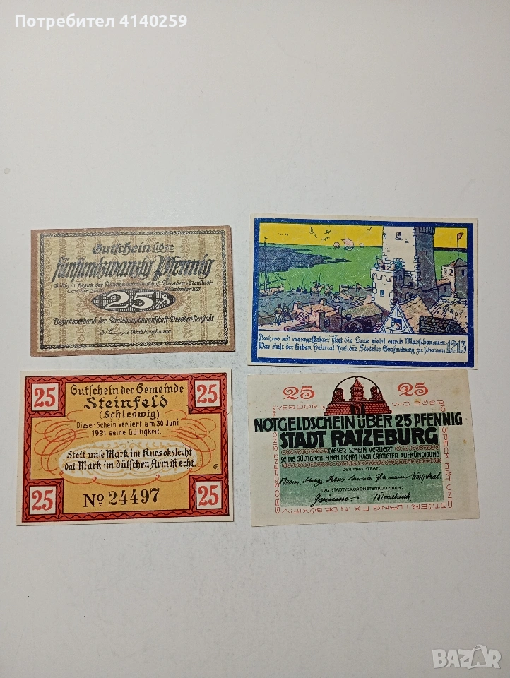 ГЕРМАНИЯ БАНКНОТИ ТИП НОТ ГЕЛ СПЕШНИ ПАРИ 25 ПФЕНИГА ГРАД СТОТЕЛ 1921 Г 25 ПФЕНИГА ГРАД РАЦЕНБУРГ 1920 Г 25 ПФЕНИГА ГРАД ШАЙНФЕЛД 1920 Г 25 ПФЕНИГА ГРАД ДРЕЗДЕН 1921 Г СЪСТОЯНИЕ НОВО ЦЕНА ЗА 4 БРОЯ ПОЛУЧАВАТЕ СНИМАНИТЕ БАНКНОТИ РАЗГЛЕДАЙТЕ ДРУГИТЕ МИ ОБЯВИ ДА КОМБИНИРАТЕ ДОСТАВКА ЕКОНТ ЗА ВАРНА ЛИЧНО
