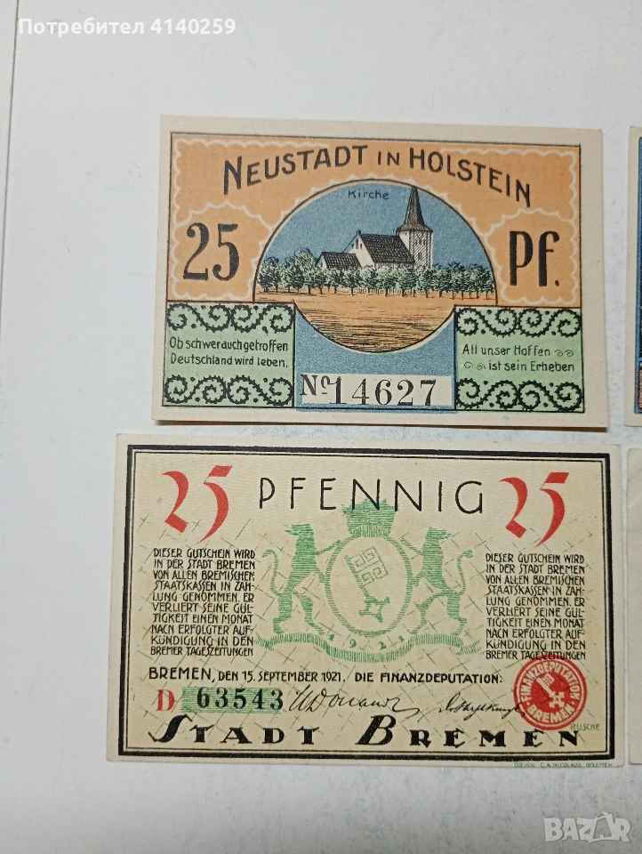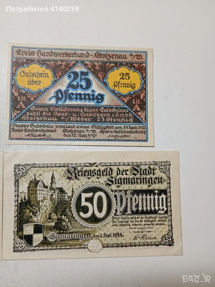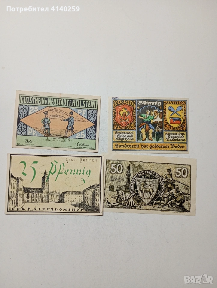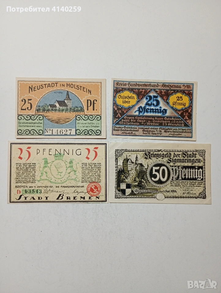 ГЕРМАНИЯ БАНКНОТИ ТИП НОТ ГЕЛ СПЕШНИ ПАРИ 50 ПФЕНИГА ГРАД ЗИГМАРИНГЕН 1918 Г 25 ПФЕНИГА ГРАД ЩОЛЦЕНАУ 1921 Г 25 ПФЕНИГА ГРАД БРЕМЕН 1921 Г 25 ПФЕНИГА ГРАД НОЙЩАТ 1921 Г СЪСТОЯНИЕ НОВО ЦЕНА ЗА 4 БРОЯ ПОЛУЧАВАТЕ СНИМАНИТЕ БАНКНОТИ РАЗГЛЕДАЙТЕ ДРУГИТЕ МИ ОБЯВИ ДА КОМБИНИРАТЕ ДОСТАВКА ЕКОНТ ЗА ВАРНА ЛИЧНО