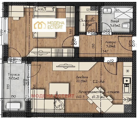 Разпределение: Антре, дневна с излаз на обща тераса към спалнята, баня с тоалетна и склад.