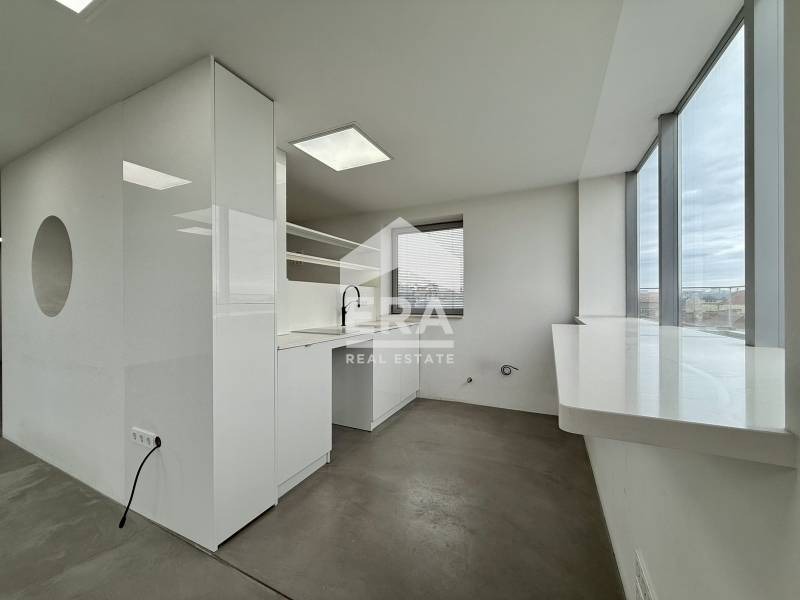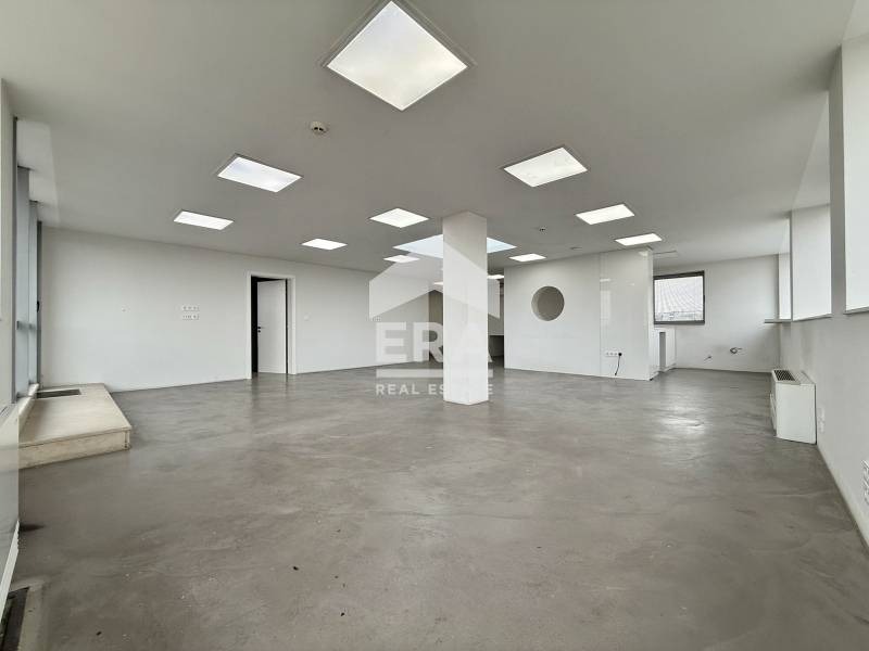 Разпределение: Просторни и светли работни зони от тип open space, две самостоятелни помещения, подходящи за кабинети или конферентни зали, кът с кухненски бокс, сървърно помещение, два санитарни възела, просторна тераса 80 кв. м. около целия имот с панорамни гледки към града.
