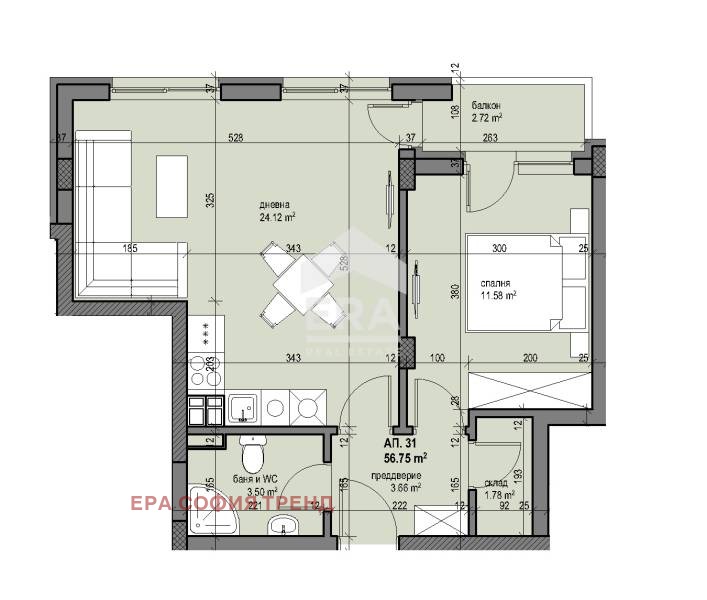 Продажба на двустаен апартамент в новострояща се сграда в начален етап на строителство, с планирано завършване през 2027 г. Имотът е разположен на пети етаж от общо осем и е със застроена площ от 56.75 кв.м и обща площ от 65.71 кв.м. Разпределението включва: дневна с кухненски бокс и трапезария (24.12 кв.м) с излаз към балкон (2.72 кв.м), спалня (11.58 кв.м), баня с тоалетна (3.50 кв.м), преддверие (3.66 кв.м) и склад (1.78 кв.м). Изложението е североизточно. Предвидена е възможност за закупуване на гараж или паркомясто в сградата.