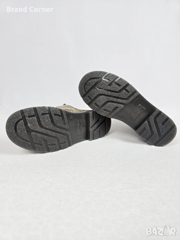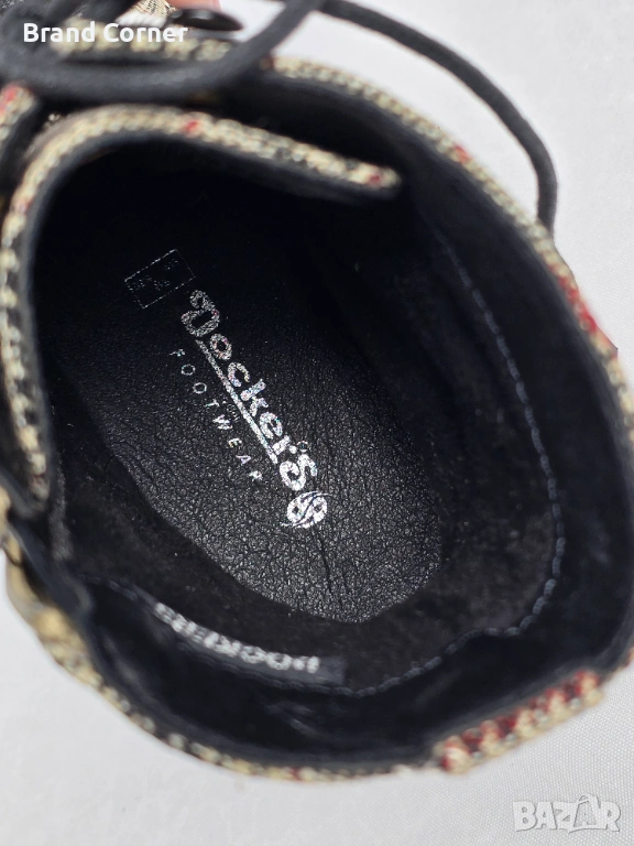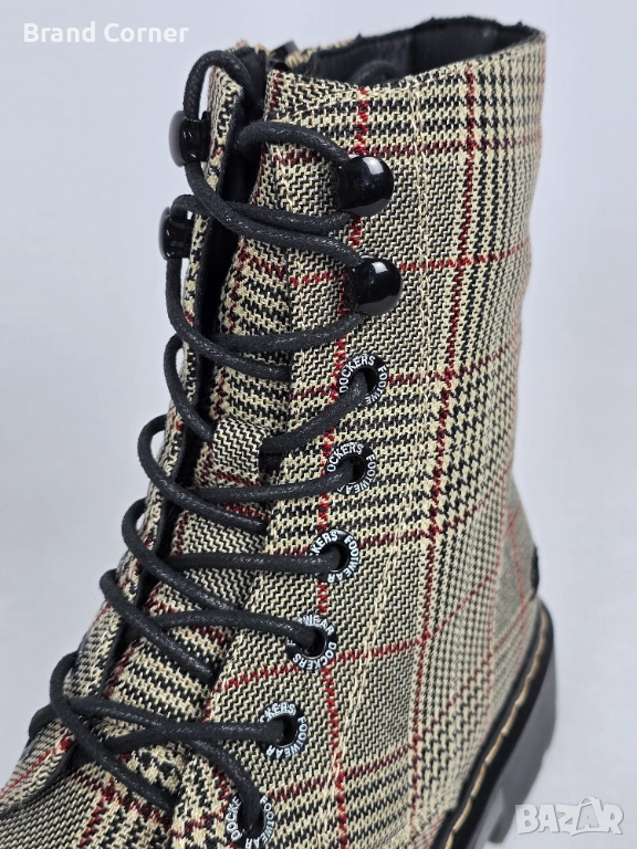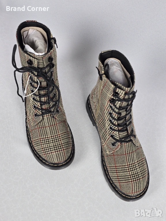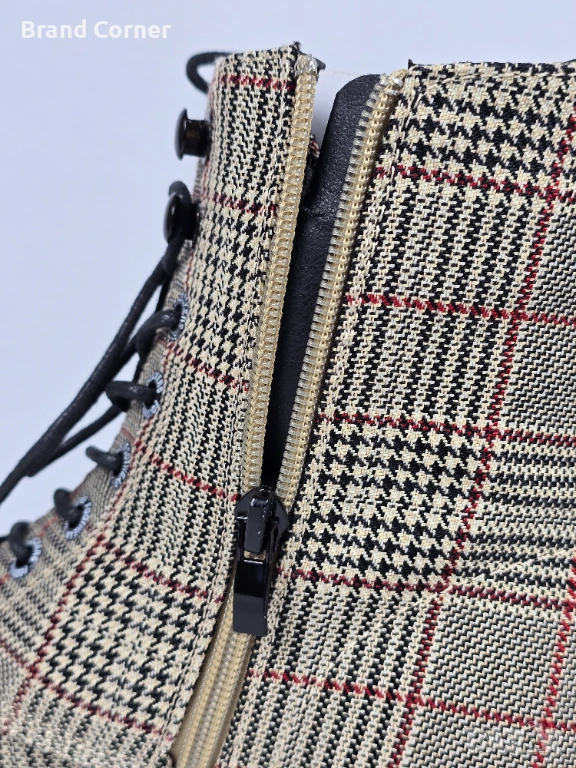 Моделът е стилен и отличителен, с текстилен горен материал в каре десен в бежово, черно и бордо. Ботите са с връзки отпред и практичен страничен цип, което ги прави удобни за обуване и регулиране. Подметката е черна, стабилна и грайферна, подходяща за ежедневна употреба през есенно-зимния сезон.