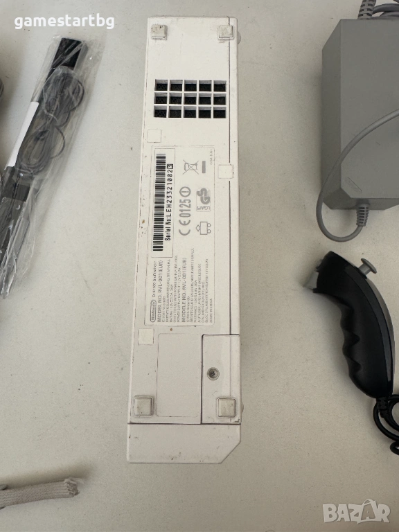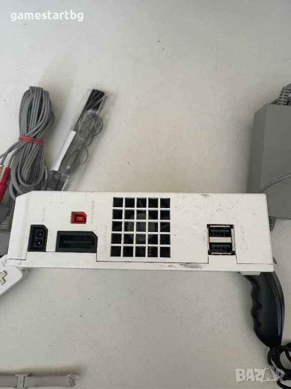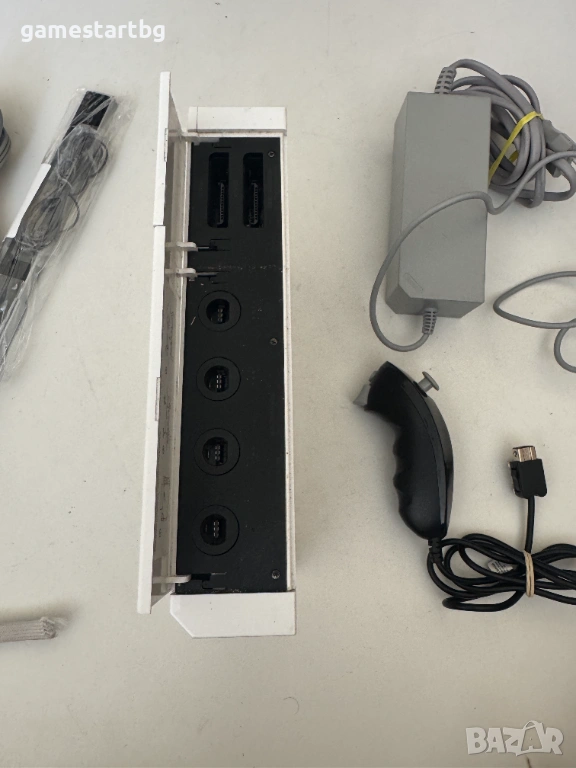 Към нея има оригинален remote контролер,неоригинален nunchuk,неоригинален сензор бар,оригинално захранване и оригинален кабел за връзка с TV,