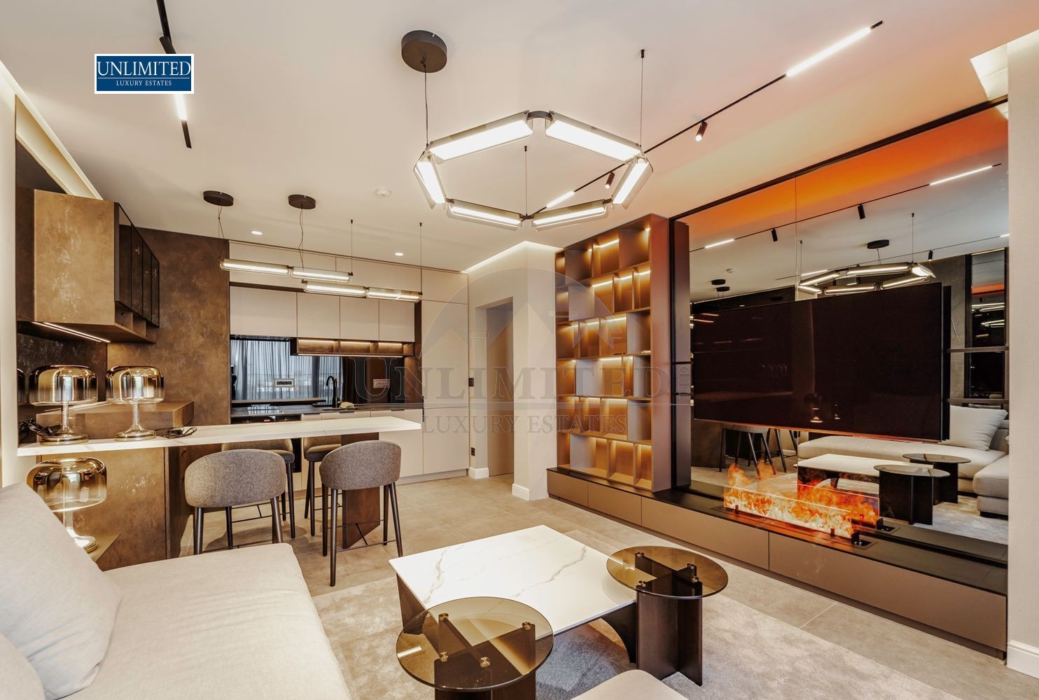 био камина, интегрирана в дизайнерска TV стена с огледални повърхности