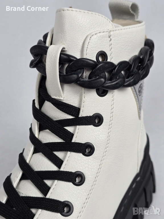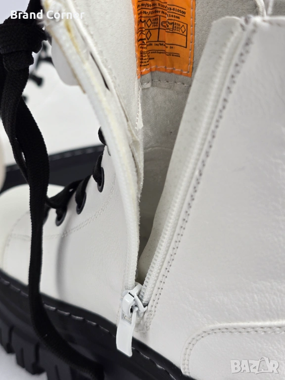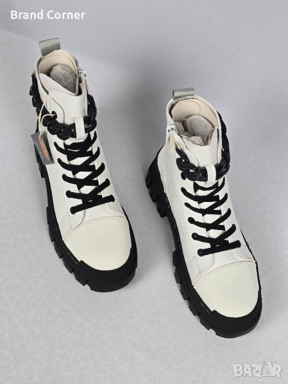 Закопчаване: Комбинирано – класически черни връзки с метални капси за прецизно регулиране и удобен бял страничен цип, благодарение на който се обуват и събуват за секунди.