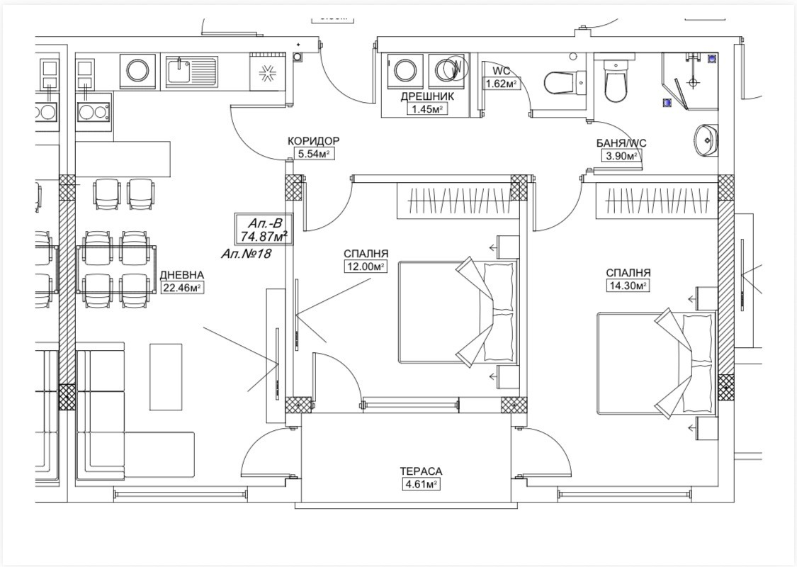 Тристаен апартамент в новострояща се жилищна сграда на етап предстоящ акт 14. Обособени са две спални, дневна с кухня, килер, баня и тоалетна в отделни помещения и две тераси. Жилището ще се предаде с измазани и шпакловани стени и тавани, на пода - циментова замазка, петкамерна ПВЦ дограма с троен стъклопакет, блиндирана входна врата. Сградата ще бъде завършена с луксозни общи части, хидравличен асансьор, фасадата с цялостна топлоизолационна система с декоративни елементи и луксозна външна мазилка. Краен срок на завършване с разрешение за ползване - началото на 2027 г.