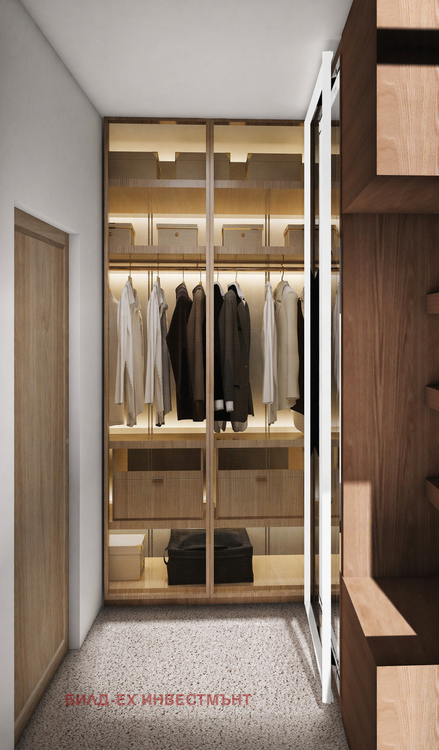Разпределение на апартамента: Входно антре, хол с кухненски бокс и трапезария, спалня /детска стая/, баня с тоалетна, спалня към която има гардеробна и баня с тоалетна, тераса 46 кв. с изложение югоизток и втора тераса 8 кв. с изложение север.