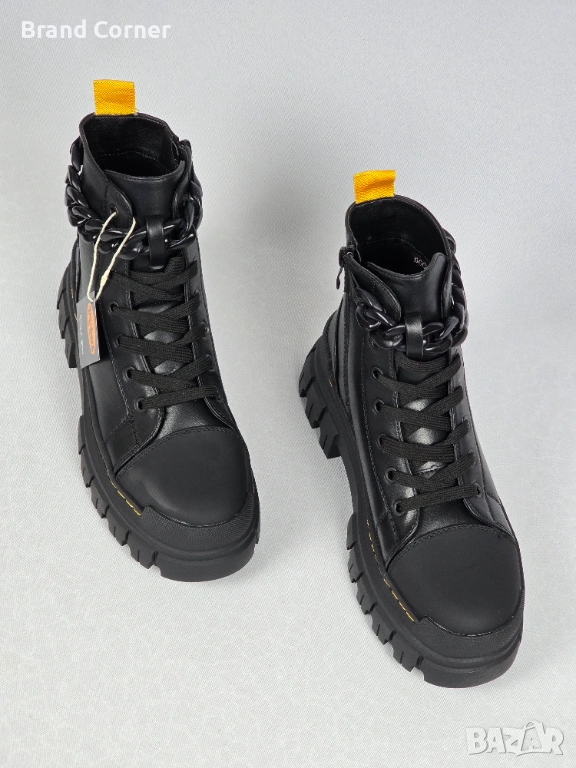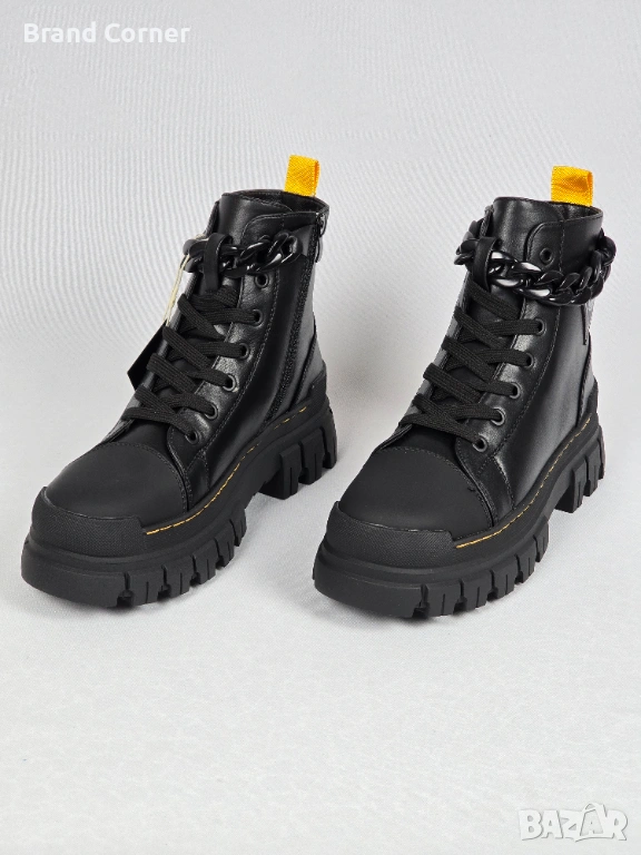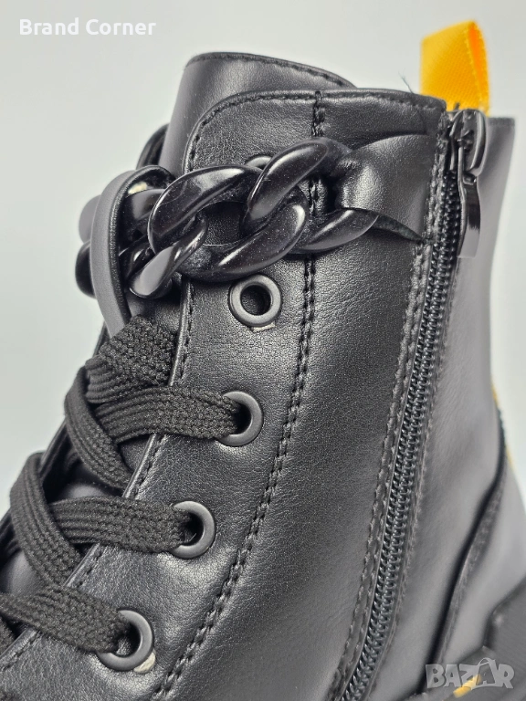 Специфични детайли: - Атрактивна масивна черна верига в предната част (върху връзките), която придава бунтарски и модерен вид на обувката.