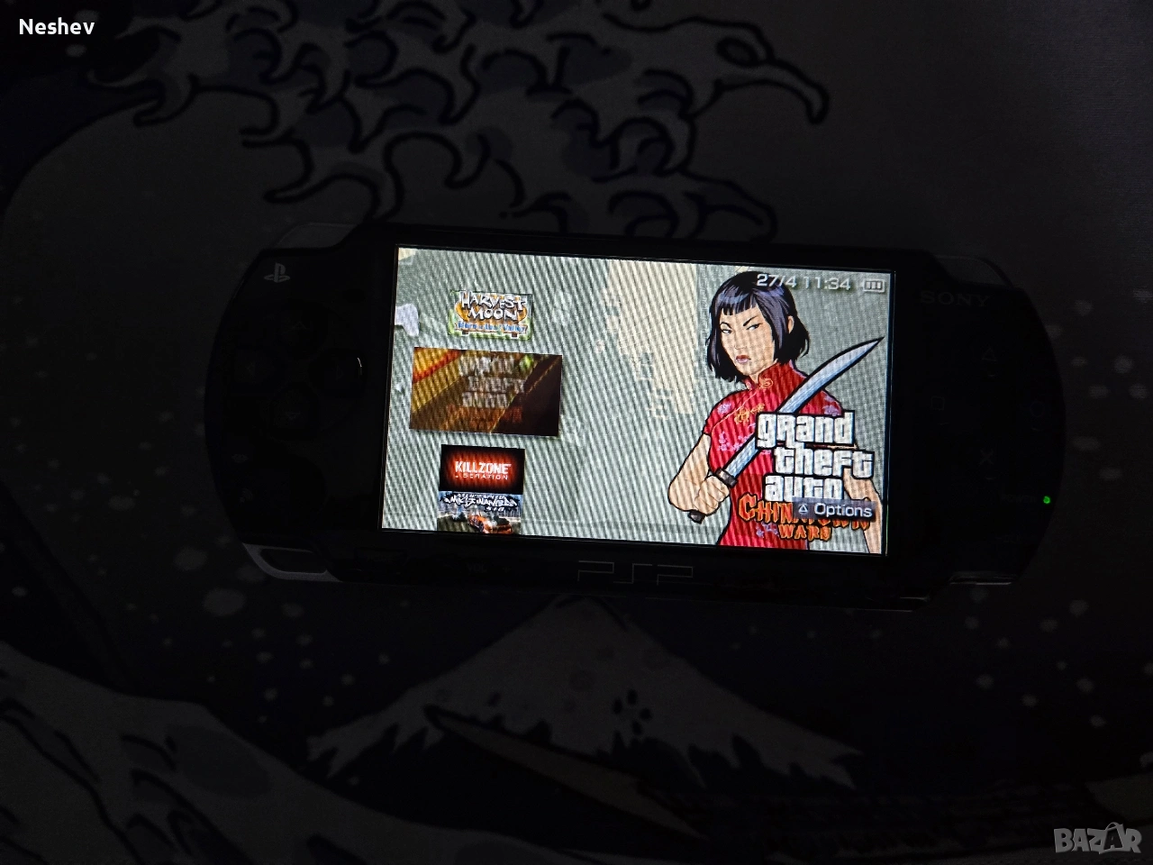 Конзолата е в комплект с батерия, оригинално зарядно и карта памет 8GB. Хакната е с ARK4 и има инсталирани игри и емулатор за Gameboy advance.