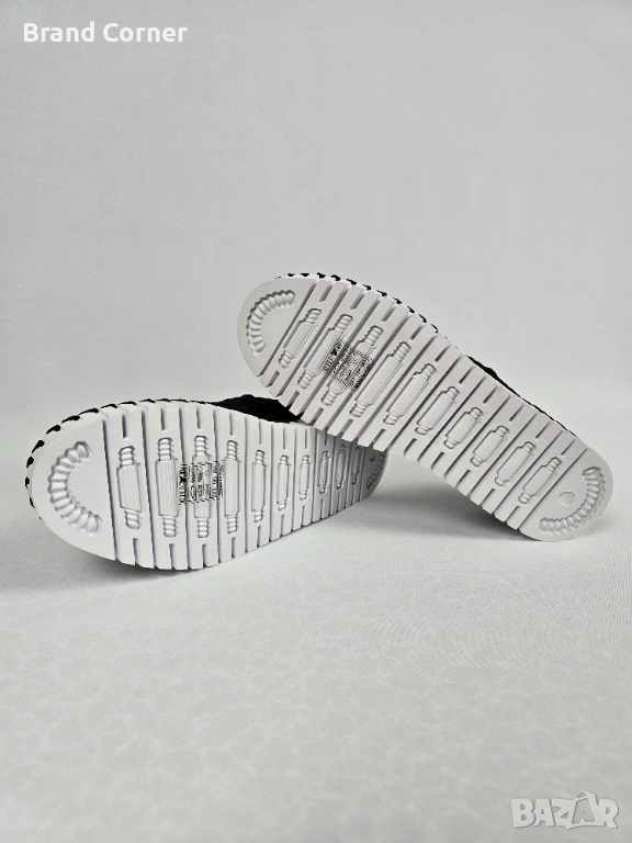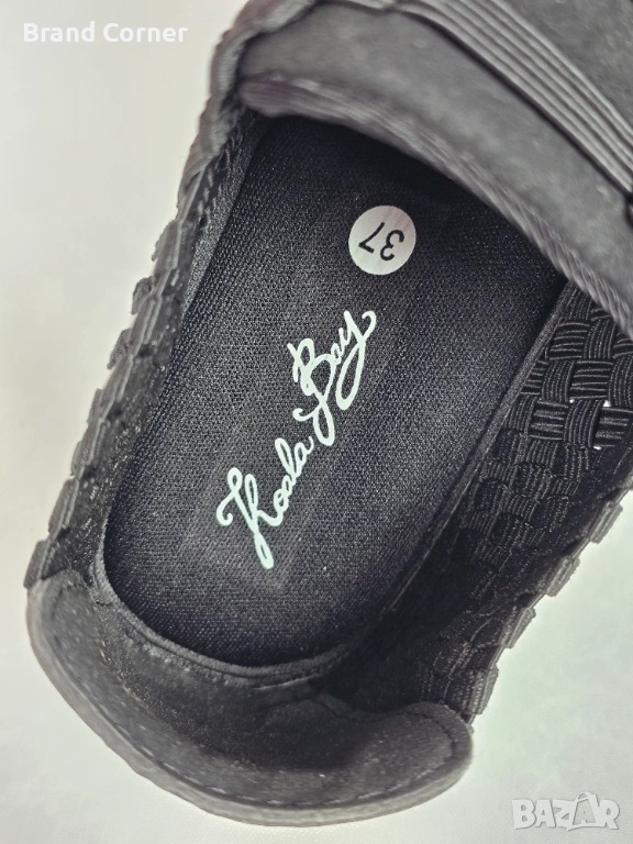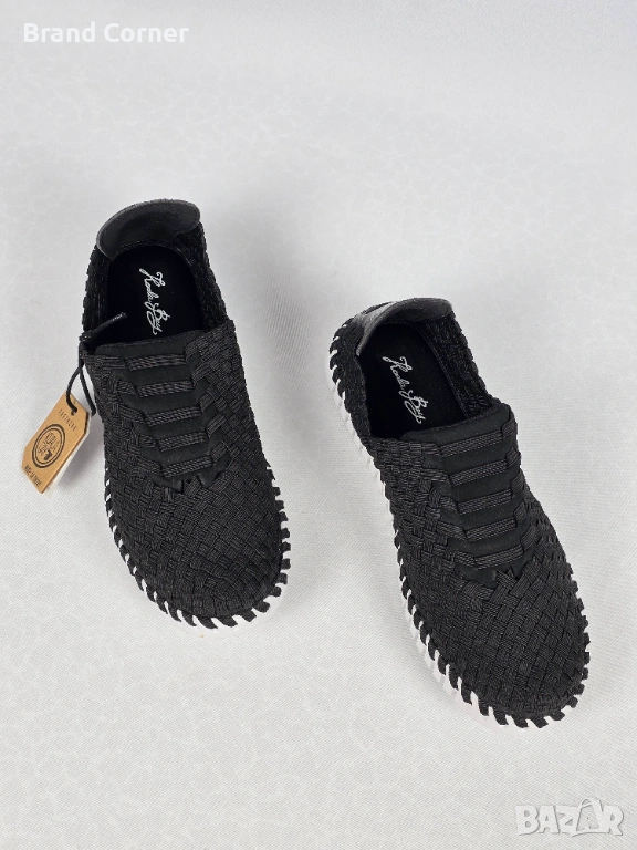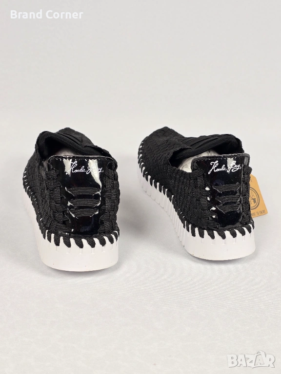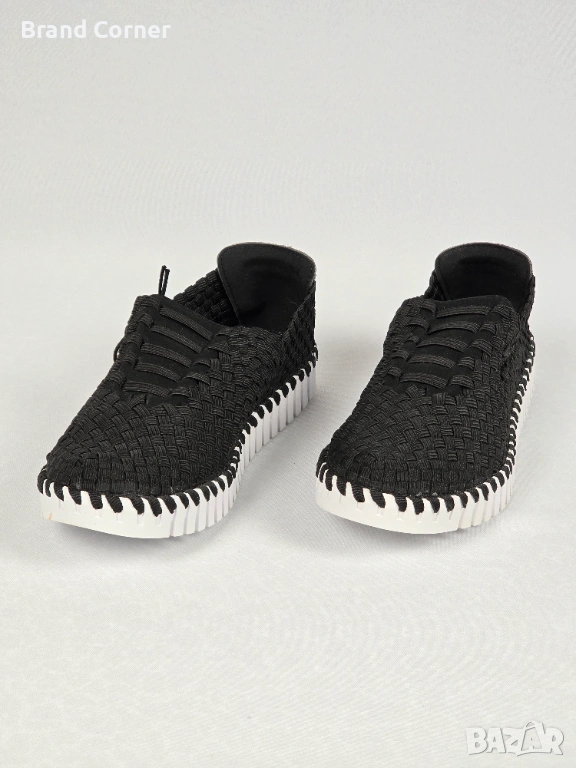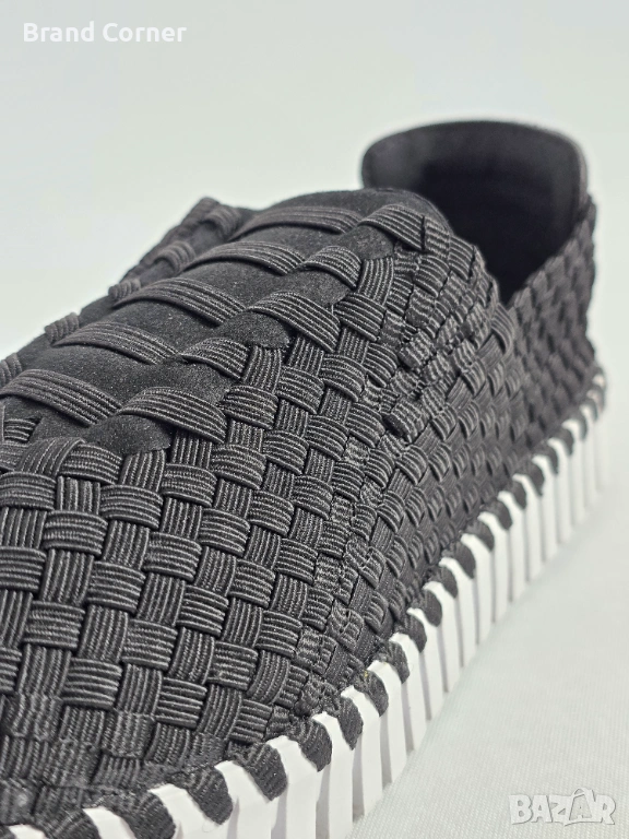 Моделът е тип slip-on / ежедневни спортно-елегантни обувки без връзки, с удобна еластична горна част и характерна плетена текстура. Цветът е черен, с контрастна бяла релефна подметка, която придава модерен и свеж вид.