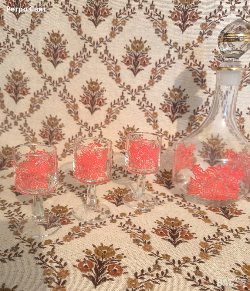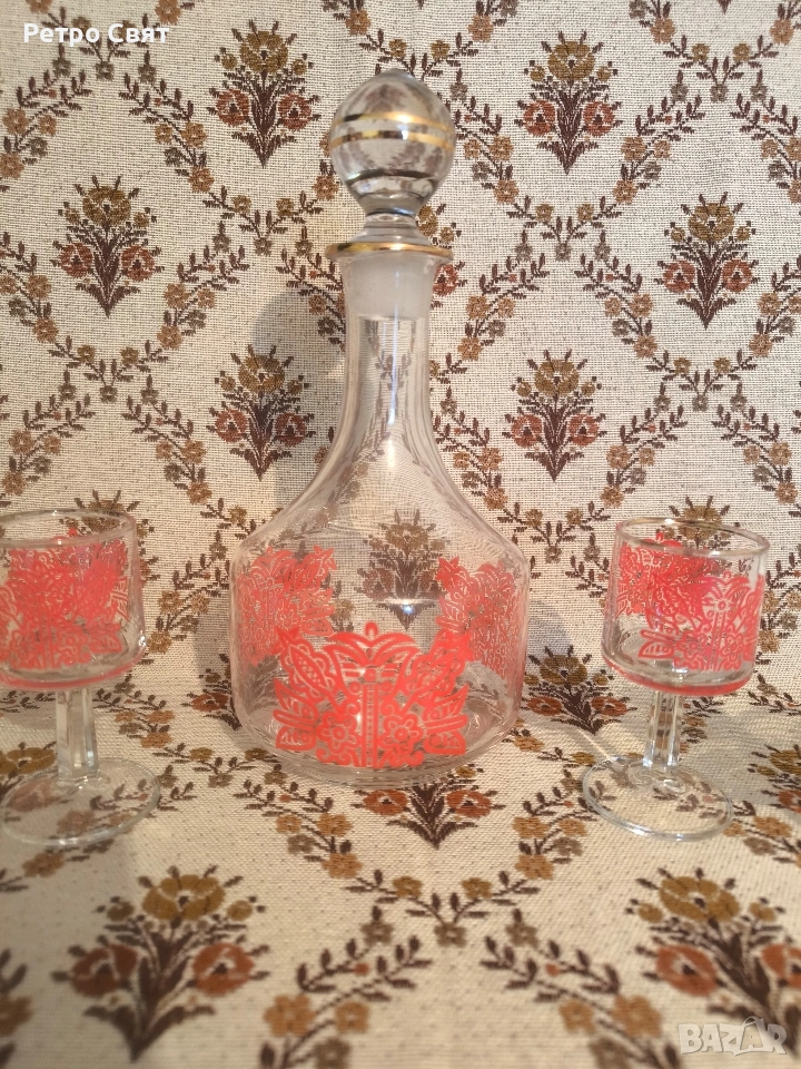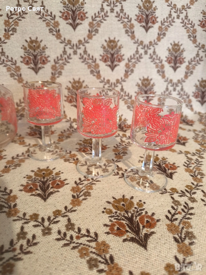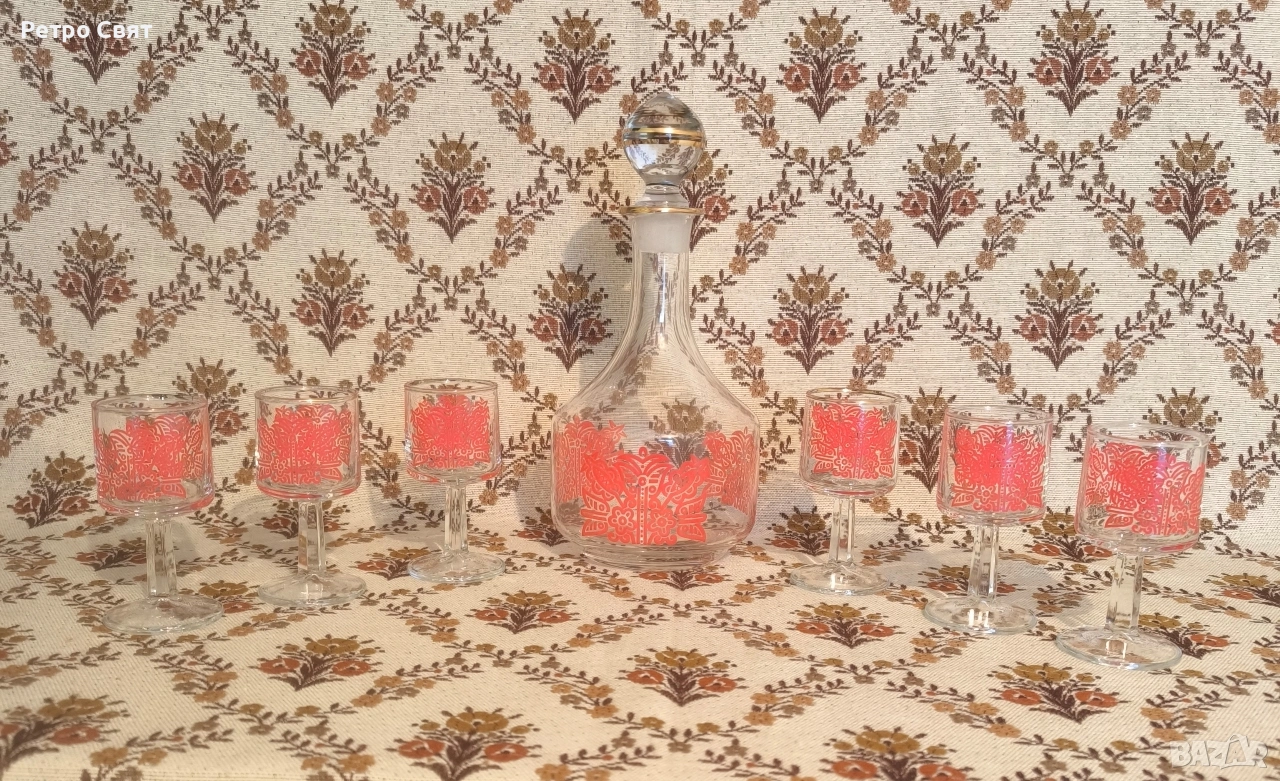 Ретро стъклен сервиз за аперитив или дижестив, внос от бившата ГДР. Красив дизайн. Като нов, без поражения. Цената е обща.