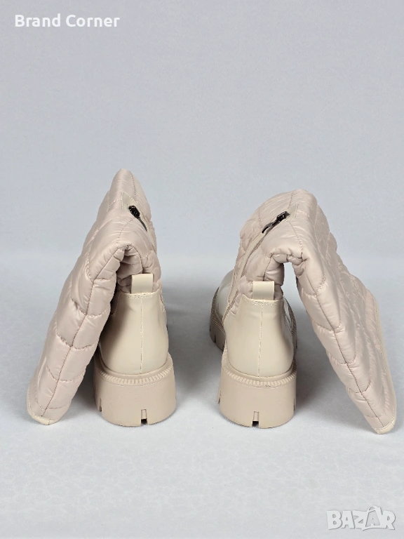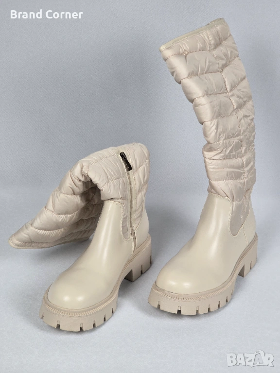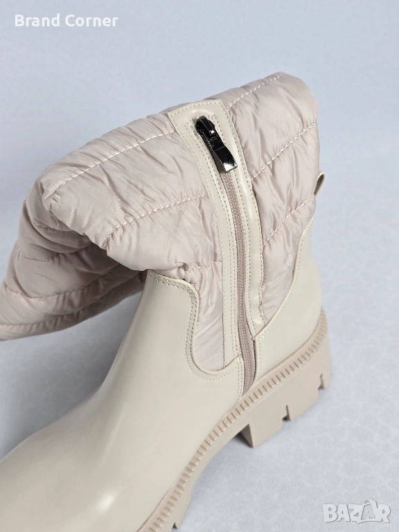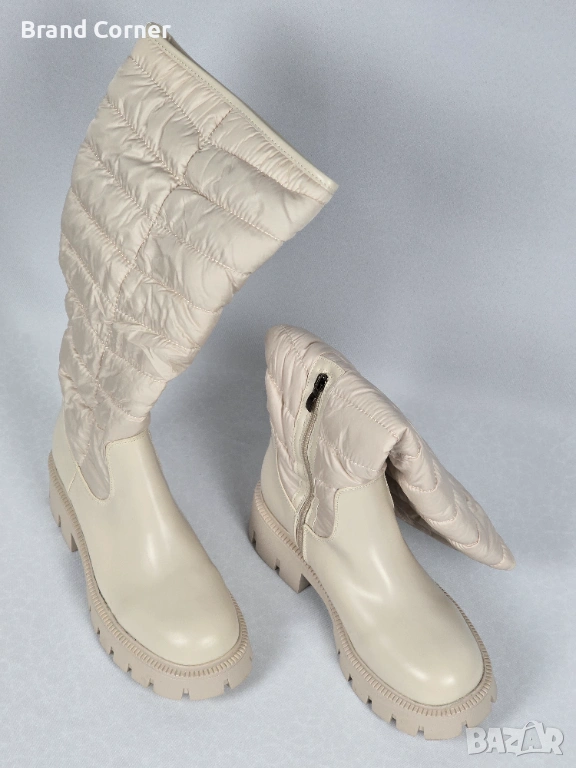 Моделът е в стилна бежово-кремава гама, подходящ за зимния сезон и ежедневна визия. Горната част е с ватиран/пухкав текстилен дизайн, който придава модерен winter look, а долната част е изработена от гладка материя тип еко кожа/синтетика в кремав цвят.