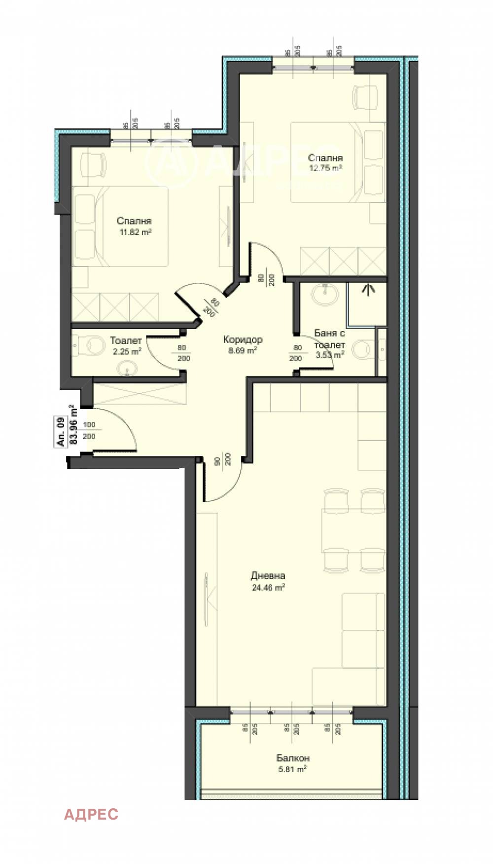 Жилището разполага с площ от 92 кв.м. разпределена в коридор, дневен тракт с кухненски бокс, две спални, балкон, баня и тоалетна, и втори санитарен възел.