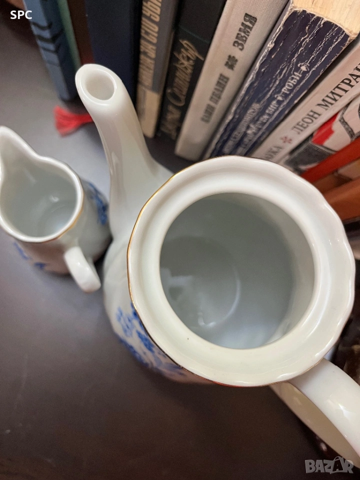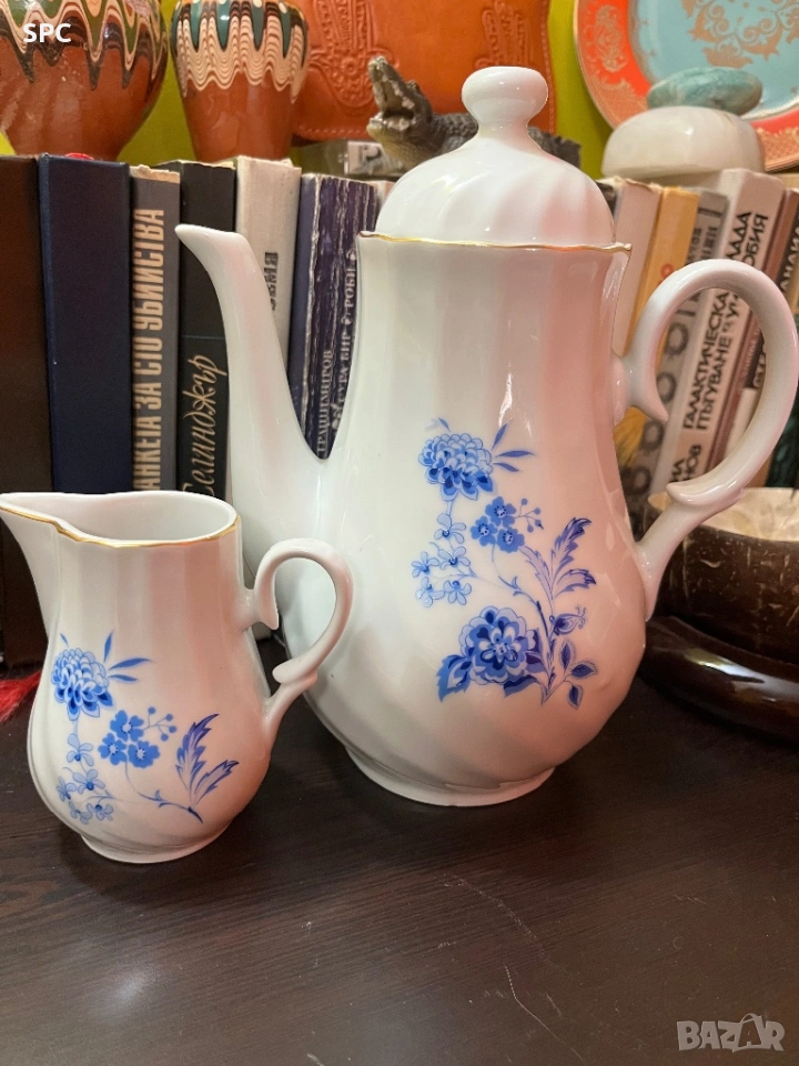 1.Висок Чайник с капак )със сини цветенца) +малка каничка към него 30€