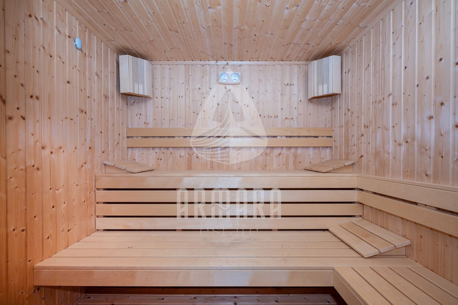 The additional house consists of three garages on the first level and living space on the second level, which includes a living room, bedroom, WC, new sauna, and a balcony.