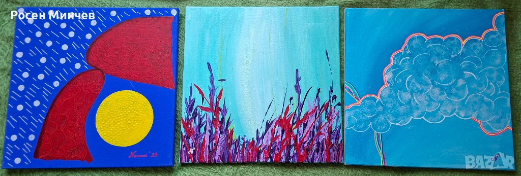 Три картини с абстрактни изображения. Наситени цветове и