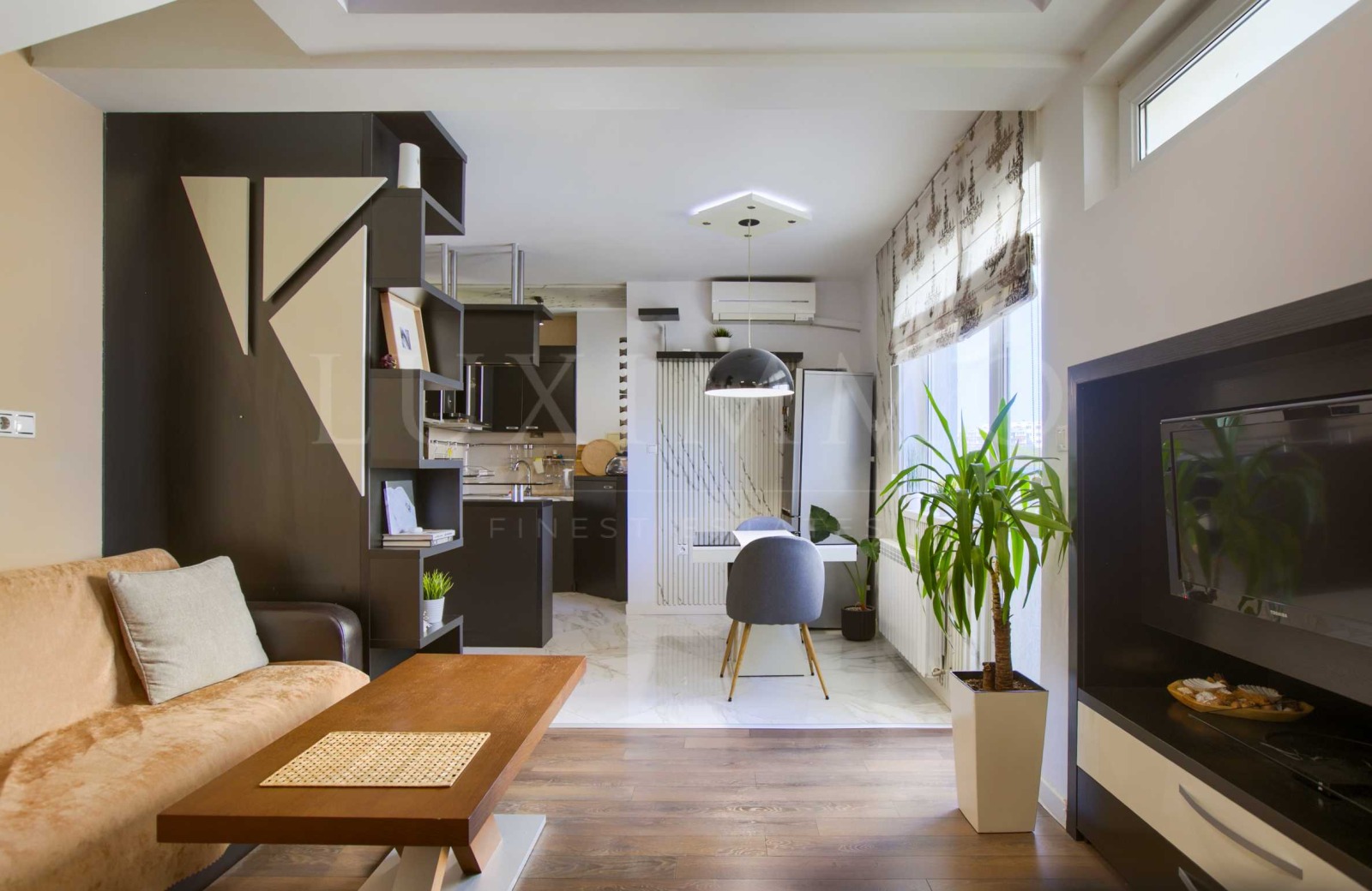 Апартаментът се продава с обзавеждането, видно от снимките. Всички мебели са специално поръчани, отличават се с високо качество на материалите и изработката, за да осигурят максимален комфорт на живущите. Вграденото LED осветление доставя допълнителен уют и приятна атмосфера.
