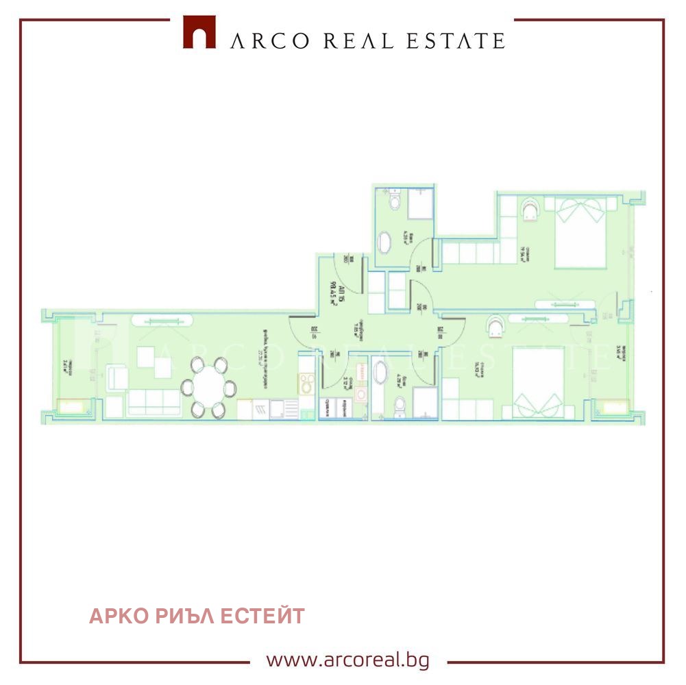Апартаментът се отличава с простор и функционалност, с изложение Север-Юг. Общата площ на имота е 115.56 кв.м. (застроена площ 98.45 кв.м.). Разпределението включва: