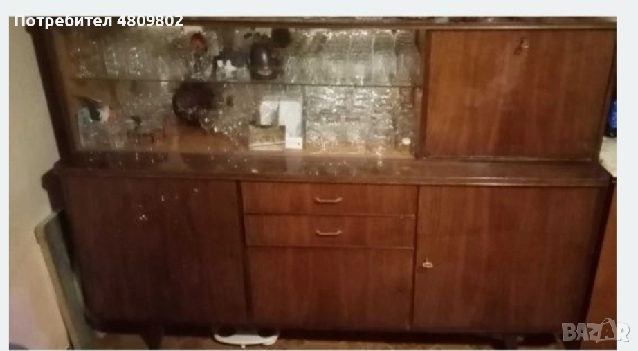 Състои се от стъклена витрина на два рафта с две стъкла, барче, две чекмеджета и три шкафа с вратички. Много място за съхранение.