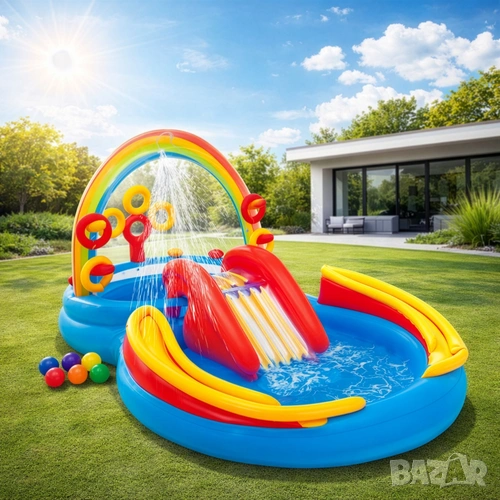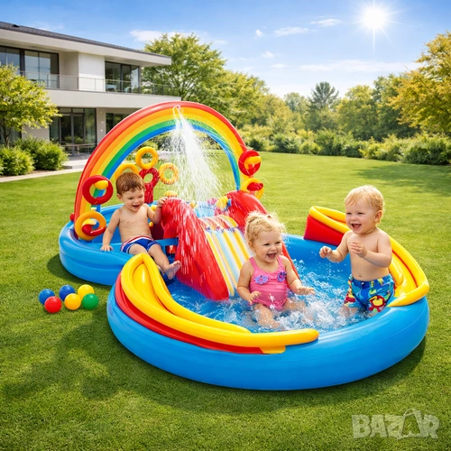 Превърнете двора си в истински детски воден рай с надуваемия център Rainbow от INTEX! Този цветен и забавен воден парк е създаден, за да осигури безкрайни часове игри през горещите летни дни. Със своята пързалка, два басейна и освежаващ фонтан, той предлага идеалната комбинация от охлаждане и забавление за най-малките.