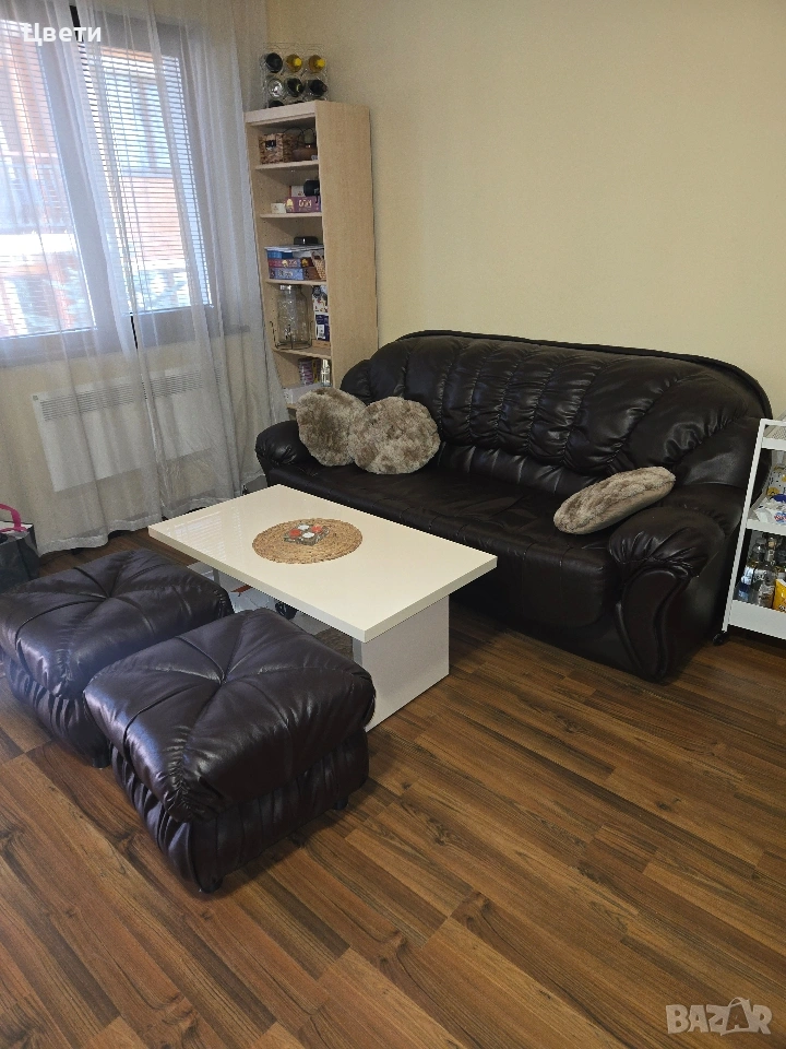 Диван разтегателен , еко кожа + две табуретки, снимка 1 - Дивани и мека мебел - 54333330 Диван разтегателен , еко кожа + две табуретки, снимка 2 - Дивани и мека мебел - 54333330 1/2