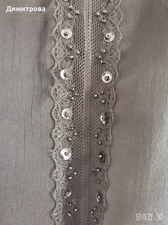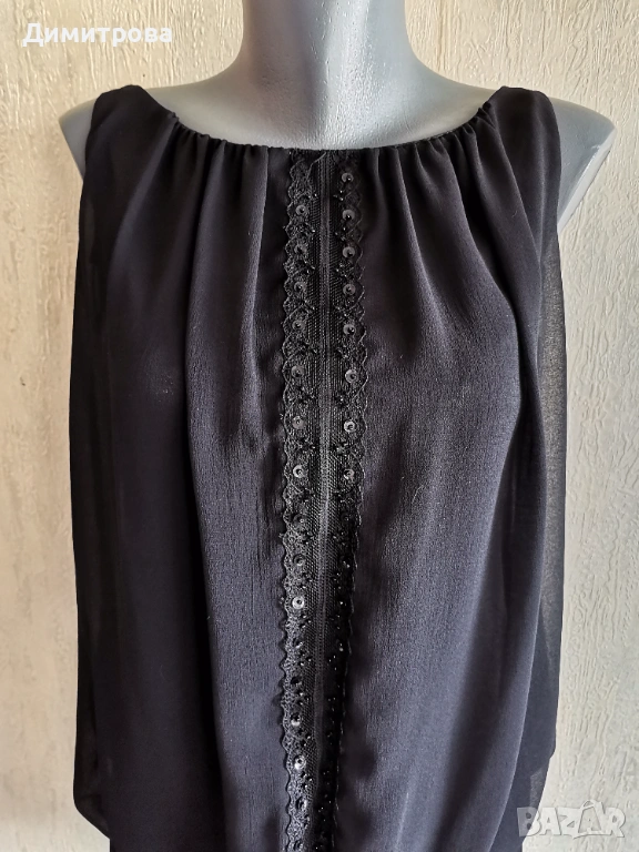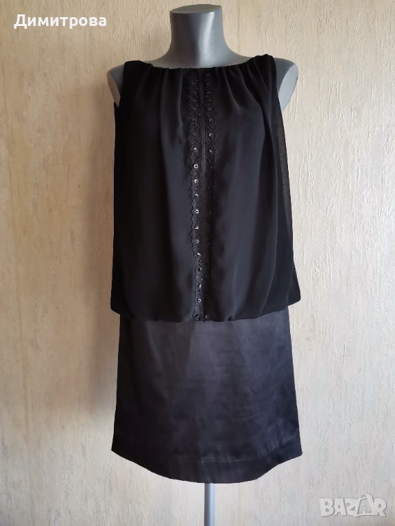 Официална черна рокля, интересен раздвижен модел, горната част е шифон с фини пайети и акцент от дантела.