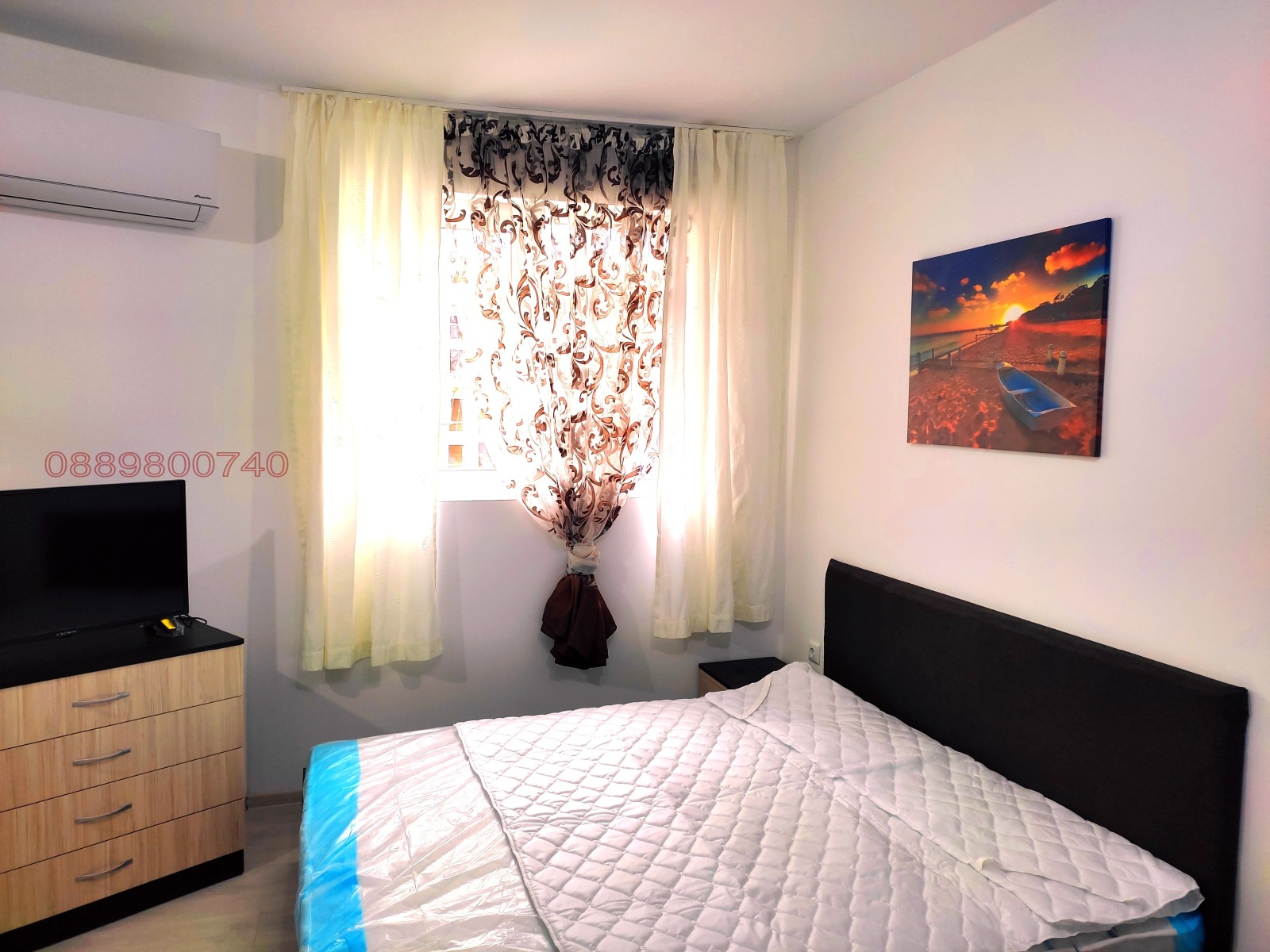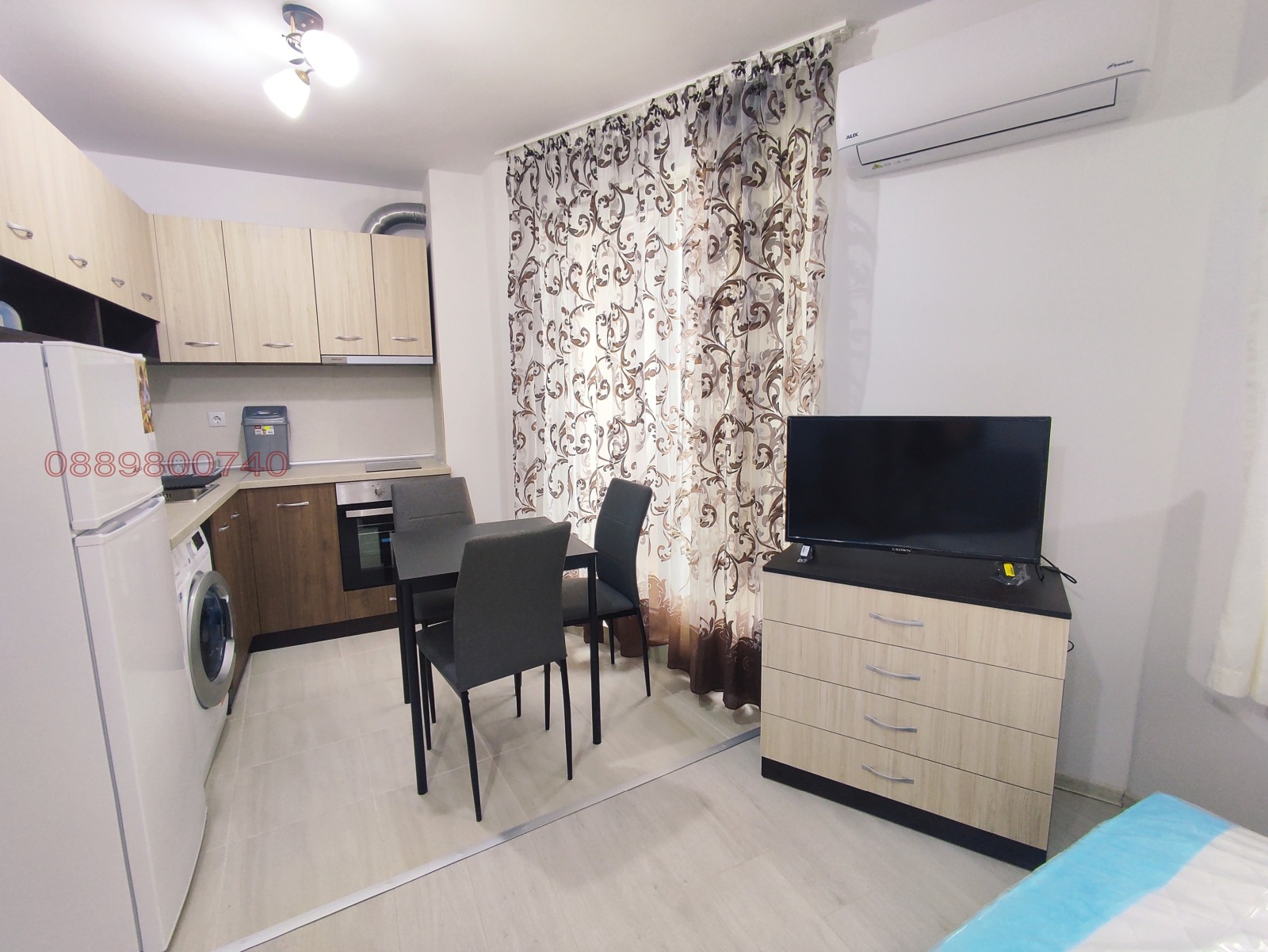 Намира се на 3ти жилищен етаж, изцяло среден. Остъклена тераса, тапицирана спалня king size размер, пералня със сушилня (капацитет 6кг сушене), климатик, вградена фурна с котлони. Леглото е с повдигащ механизъм и отдолу може да се съхранява голямо количество багаж. Свободно паркиране около блока. Входни такси-7 евро допълнително.