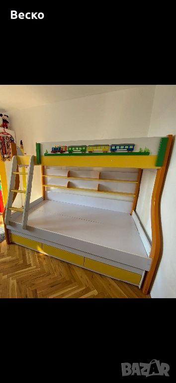 Двуетажно легло доста здраво и тежко ,материал MDF с чекмеджета в долната част и опция за трето легло което се изважда отдолу .За повече информация и снимки пишете