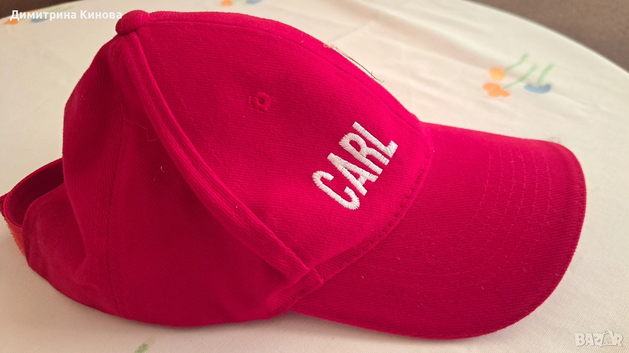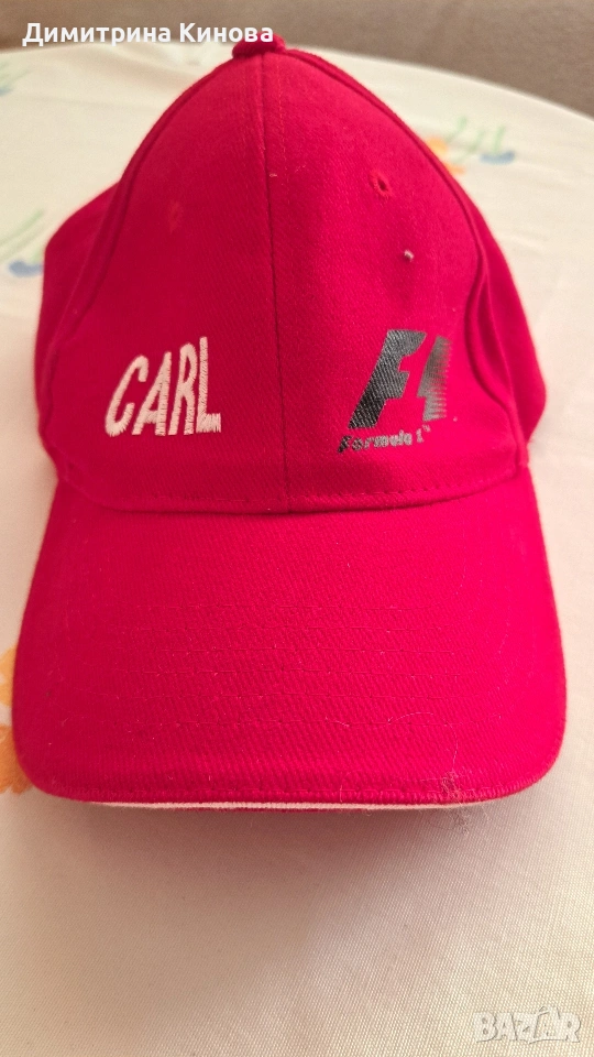 Тази червена бейзболна шапка е фен артикул, свързан с Формула 1 (F1). Тя е в класически червен цвят, който традиционно се асоциира с екипа на Ferrari. Основните детайли по нея включват: От дясната страна (гледано отпред) е поставено познатото лого на Formula 1. От лявата страна има бродиран надпис "CARL". Това може да е име на притежател, персонализация или препратка към конкретна личност или събитие.