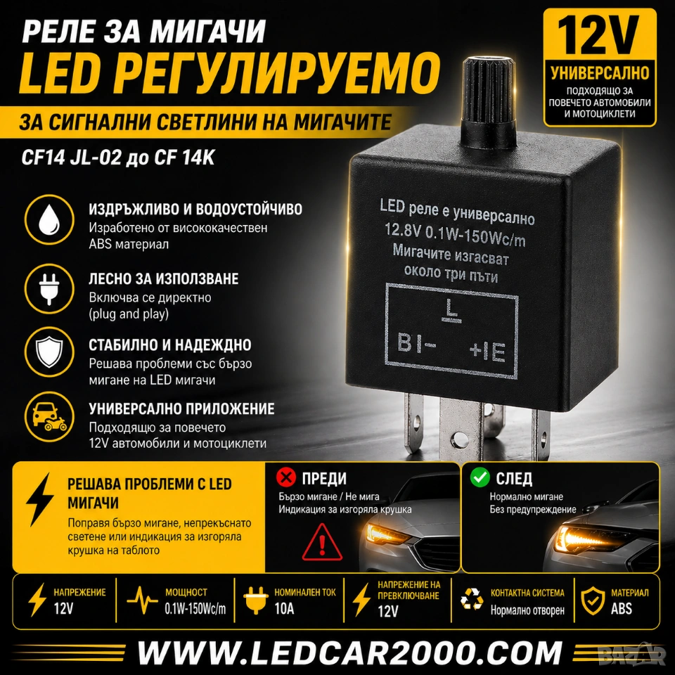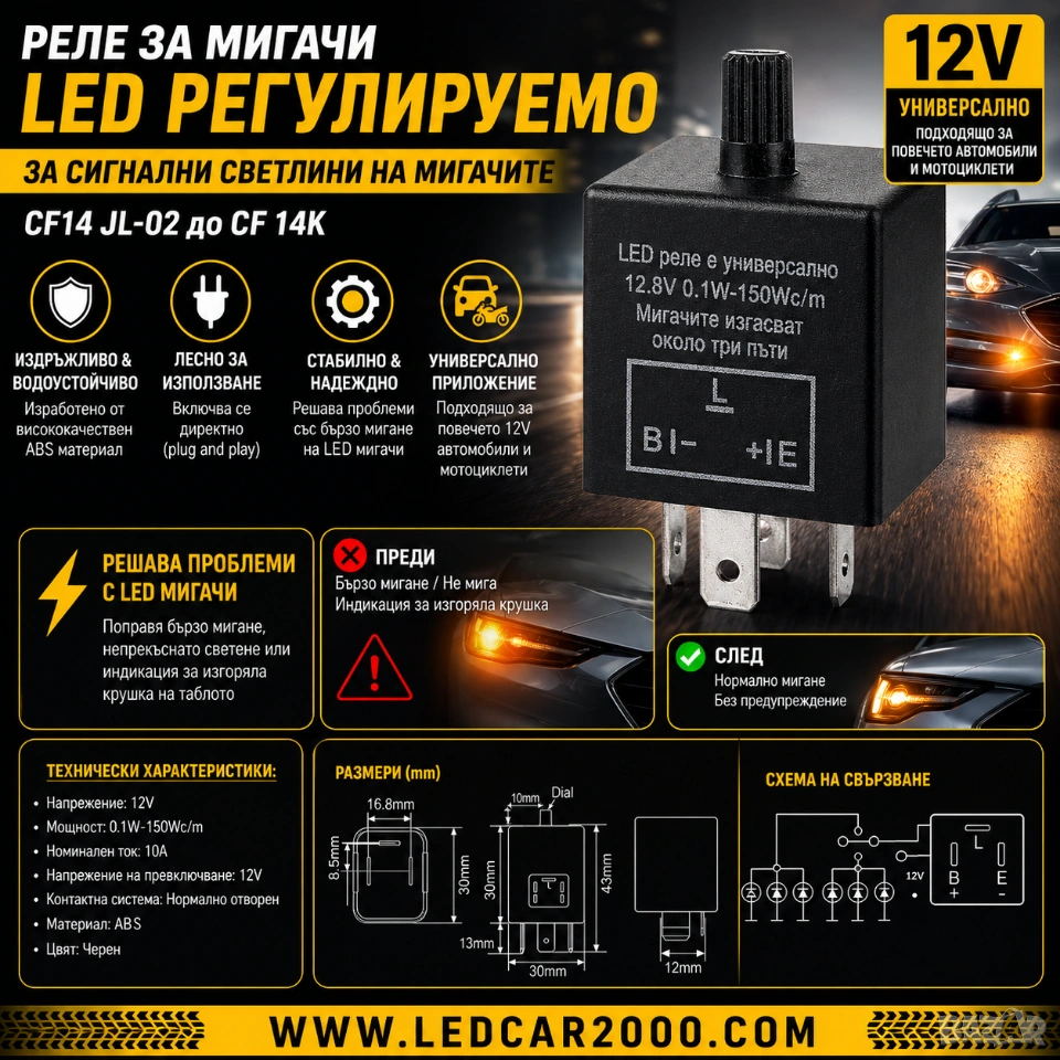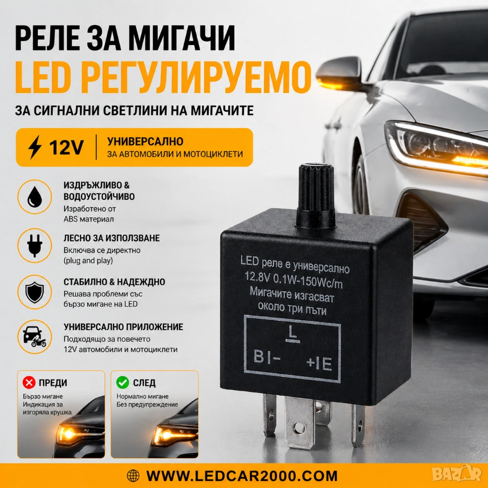 с това универсално LED реле. Забрави за бързото мигане, липсата на мигане или грешки за изгоряла крушка – решението е едно компактно устройство с лесен монтаж и надеждна работа.