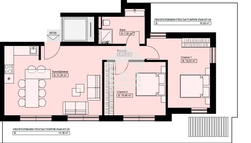 Има следното разпределение: всекидневна с кухненски бокс 31.53 кв.м., спалня с площ 18.42 кв.м., втора спалня 15.46 кв.м., баня с тоалетна 7.22 кв.м., коридор 2.73 кв.м., тераса плосък покрив.