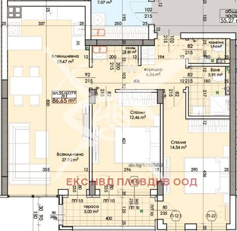 РАЗПРЕДЕЛЕНИЕ: Жилището разполага с площ от 103 кв.м., разгърната в следното функционално разпределение: коридор, баня и тоалетна коридор, две спални, тераса.