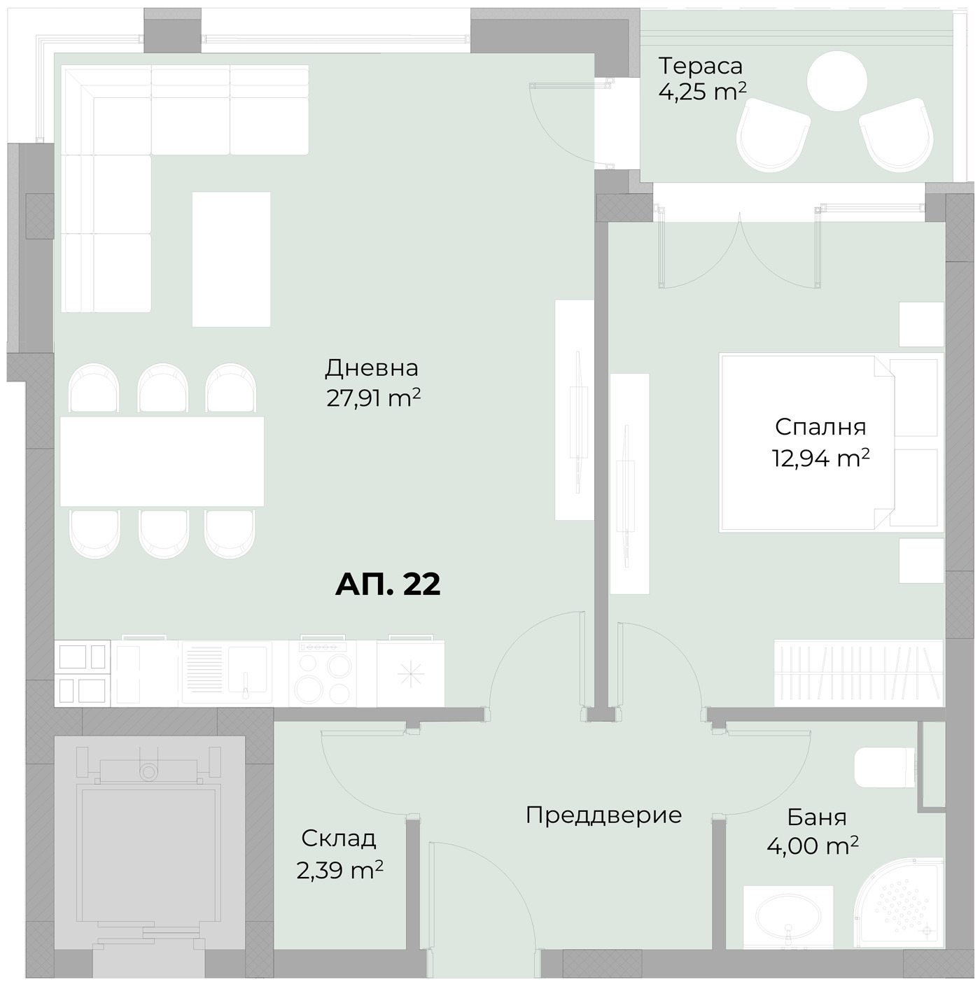 Функционално разпределение, както следва: всекидневна с кухненска зона, спалня тераса с излаз от двете помещения, баня с тоалетнa, входно антре!