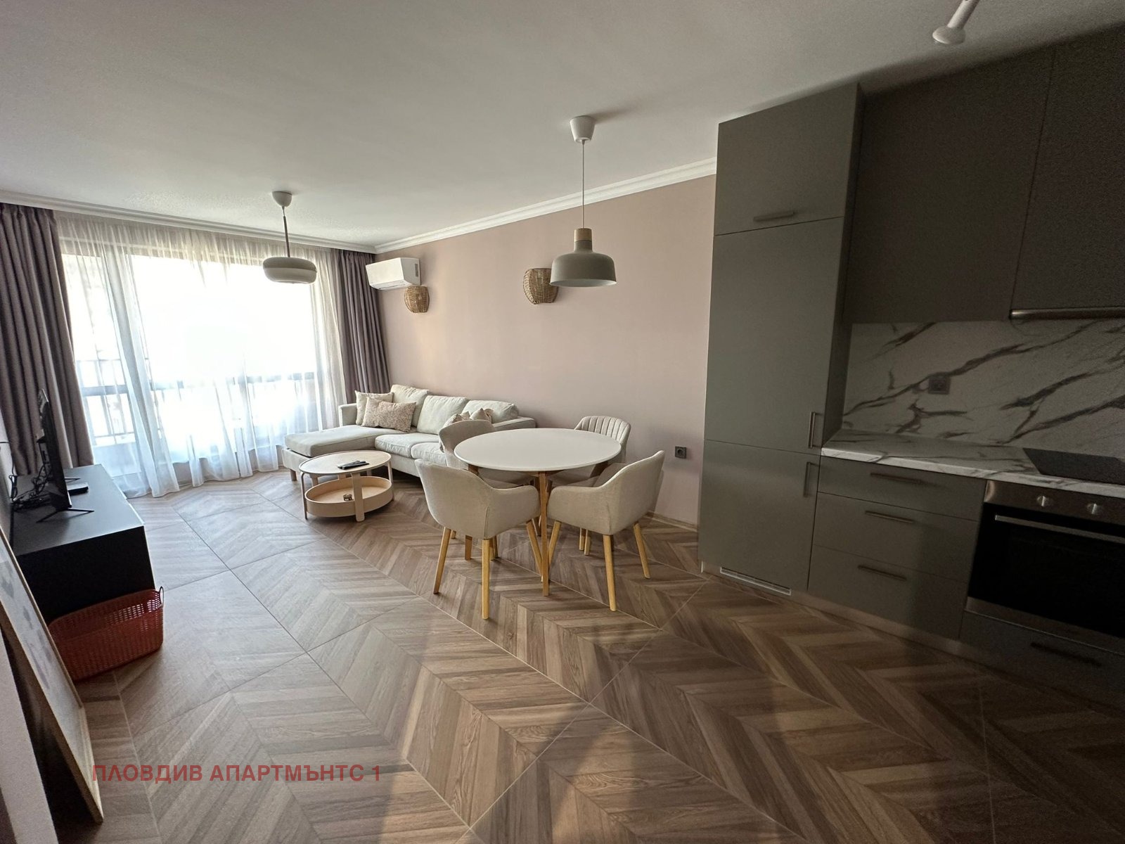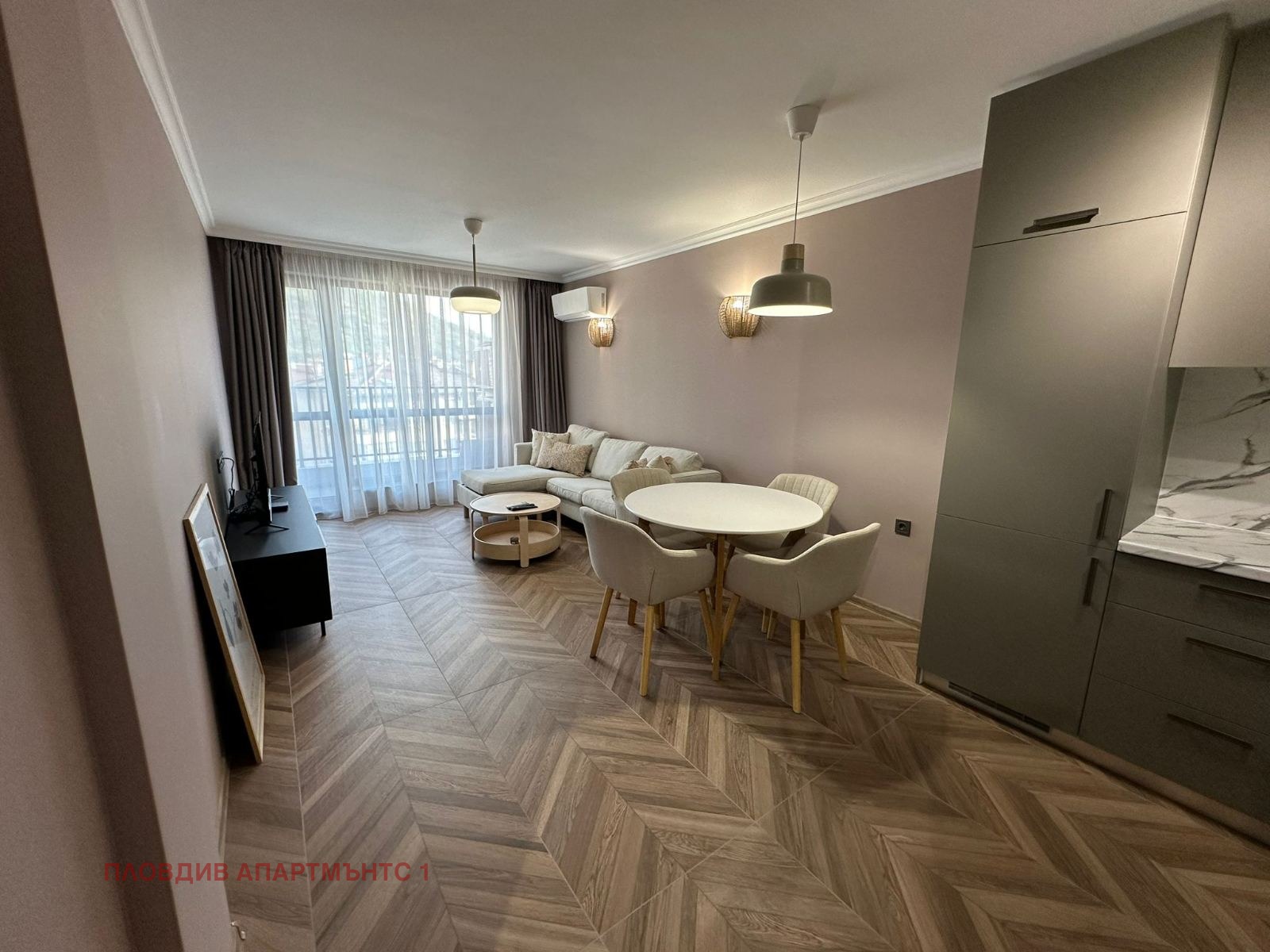 Дневна: Удобен ъглов диван, ТВ зона и трапезна маса. Големите прозорци осигуряват изобилие от светлина.