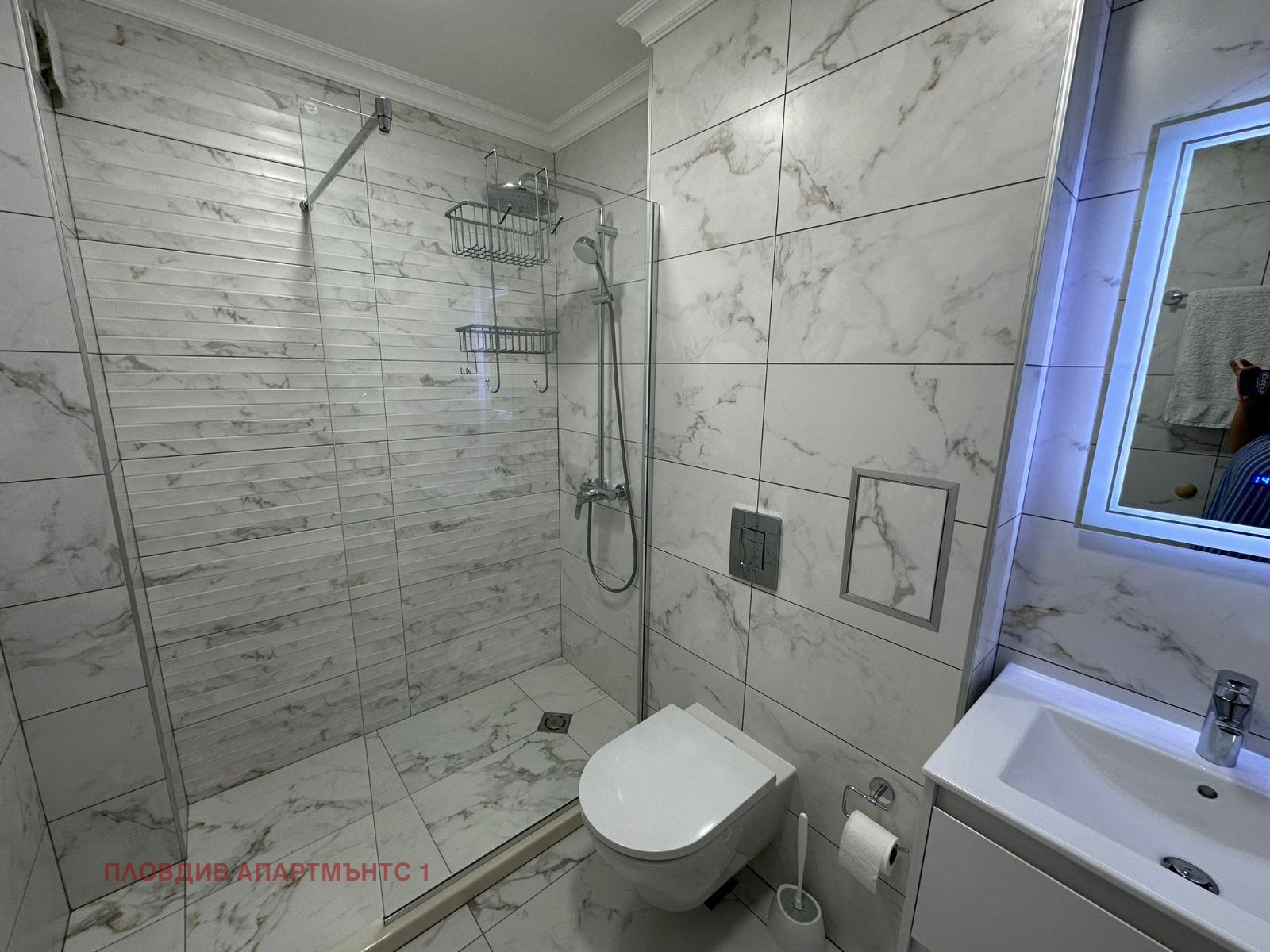 Баня: Стилна облицовка с мраморен ефект, висок клас санитария и огледало с вградено осветление.