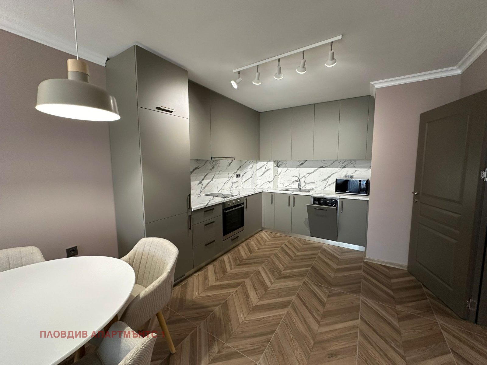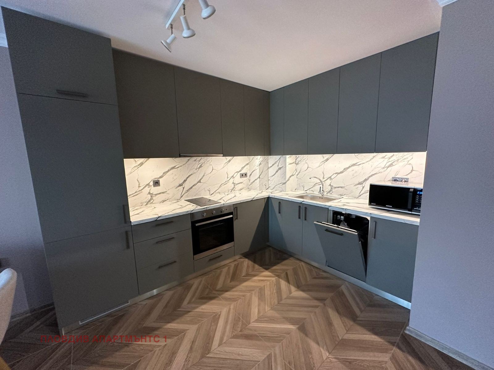 Кухня: Модерни мебели в цвят маслина. Оборудвана с фурна, котлони, абсорбатор, микровълнова печка и съдомиялна.