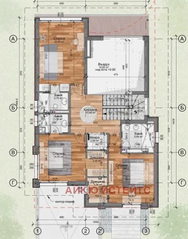 Втори етаж: три спални, две от които със самостоятелни бани и дрешници, а третата е със самостоятелна баня и общо мокро помещение със ЗП 120 кв. м.;