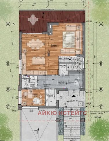 Първи партерен етаж: антре, стълбище, тоалетна, кабинет, килер, дневна с кухненски кът със ЗП 115 кв.м;