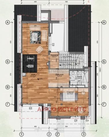 Трети етаж: спалня, баня, дрешник и дневна зона със ЗП 105 кв. м.;