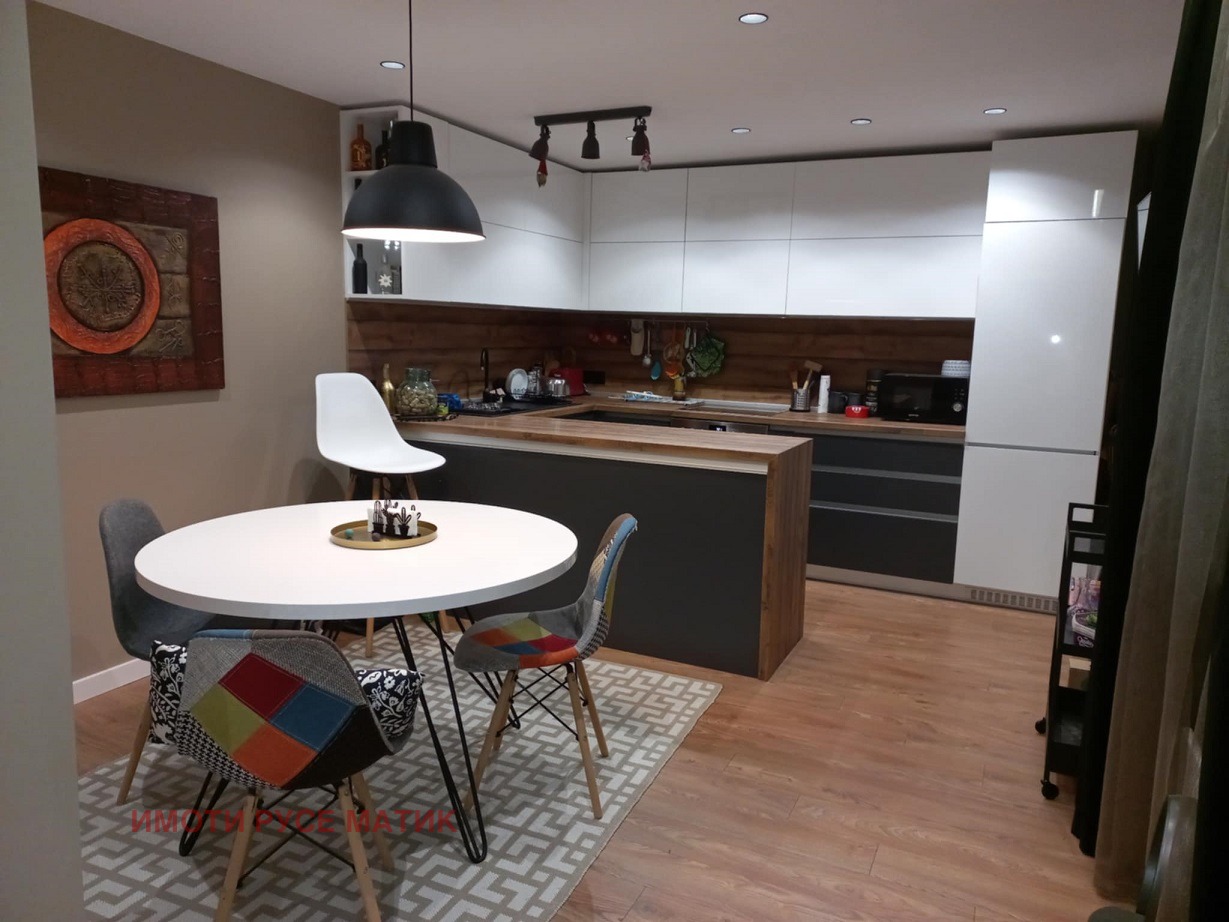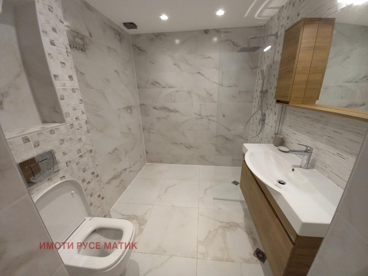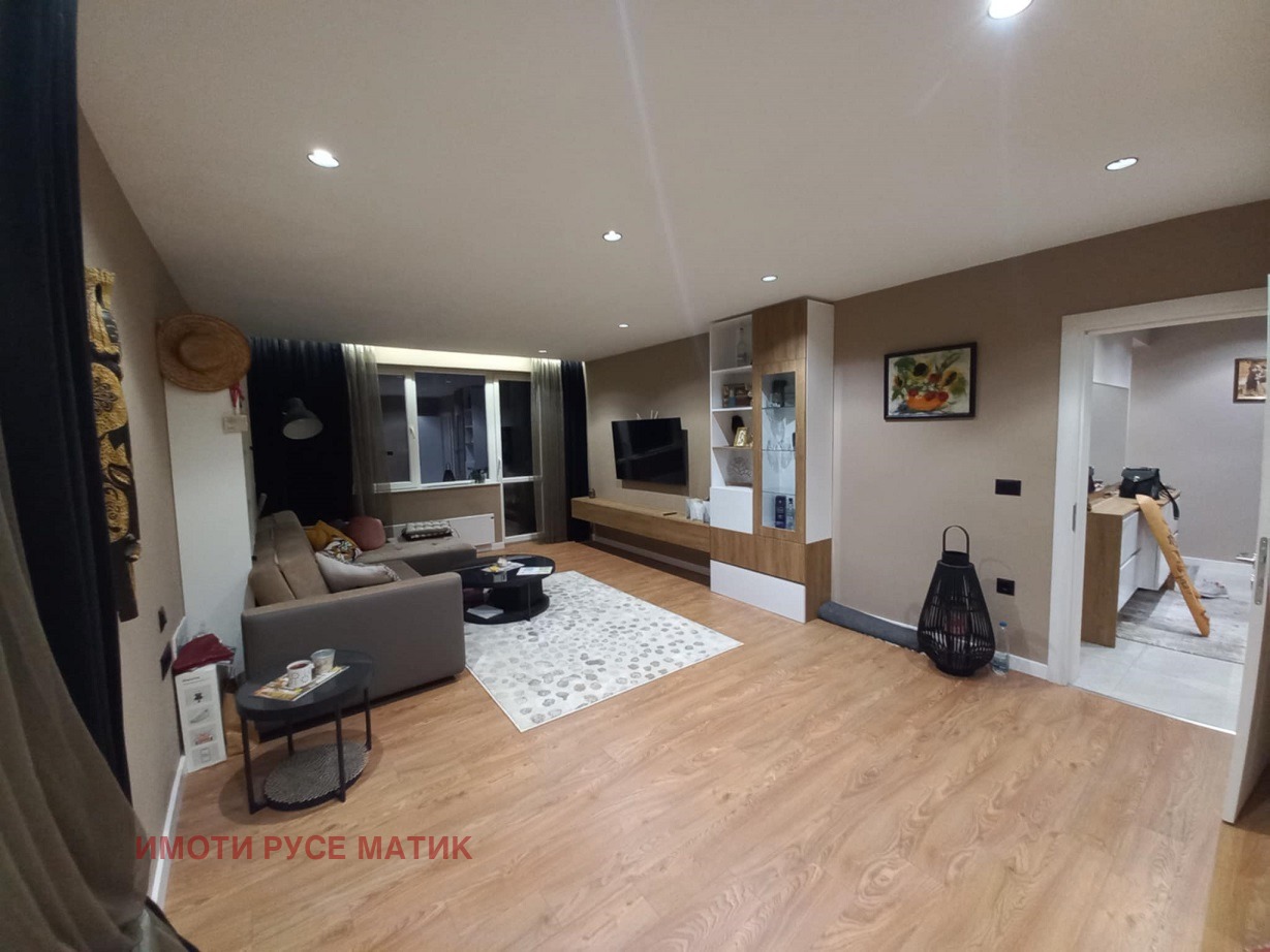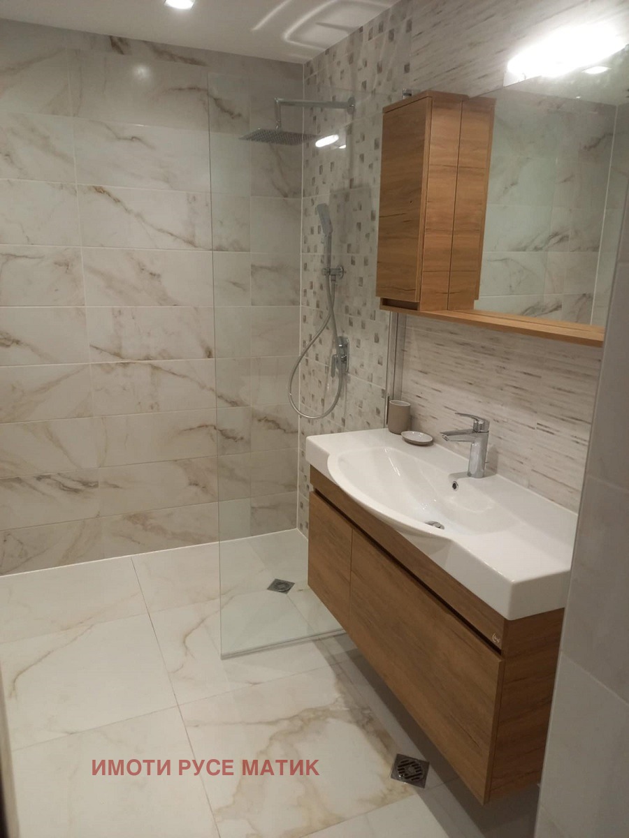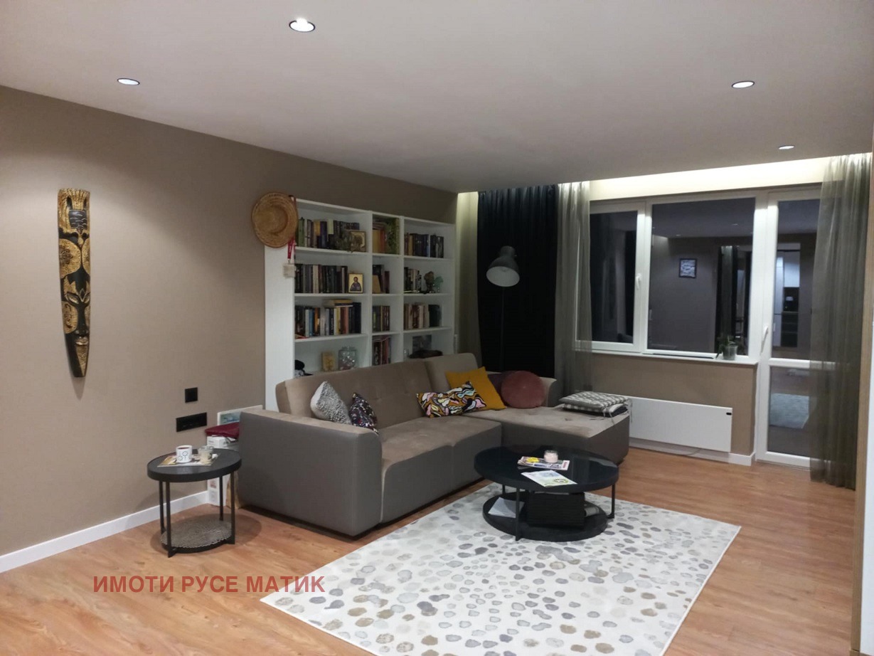Имоти Русе Матик дава под наем многостаен апартамент в Топ центъра на град Русе. Жилището се състои от две големи спални, трета детска стая, просторно помещение, в което са отделени кухня, трапезария и голям хол. Апартамент с голяма баня с тоалетна и подово отопление, втора тоалетна, в която е обособен кът с пералня и сушилня. Жилище с три изложения - изток, запад и юг, като има тераси и в трите посоки. Спалните са към тих вътрешен двор. Имот след съвременен ремонт с топлоизолация, PVC дограма, висок клас ламинат и гранитогрес. Отдава се напълно обзаведен и оборудван с всичко необходимо. Отоплението е на ток, с радиатори Adax и климатик LG Арт дизайн.